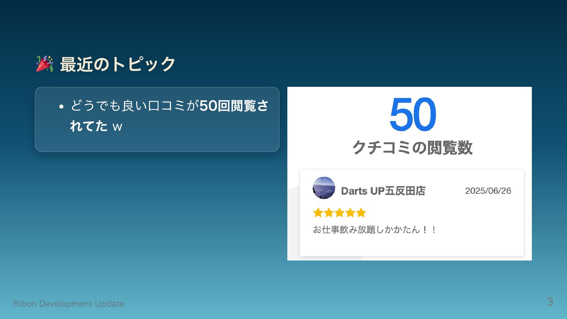 最近のトピック 最近のトピック どうでも良い口コミが50回閲覧さ れてた w Ribon Development Update 3