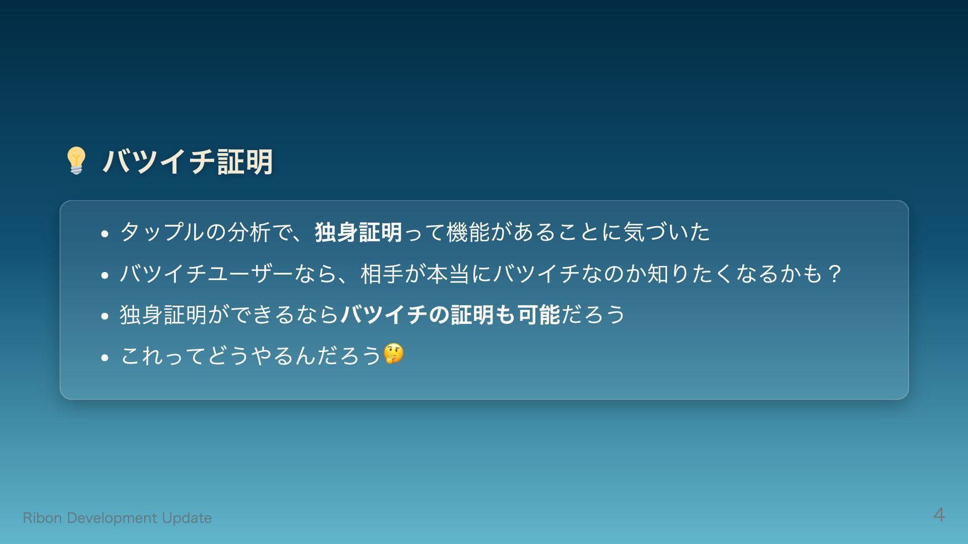 バツイチ証明 バツイチ証明 タップルの分析で、独身証明って機能があることに気づいた バツイチユーザーなら、相手が本当にバツイチなのか知りたくなるかも? 独身証明ができるならバツイチの証明も可能だろう これってどうやるんだろう🤔 Ribon Development Update 4