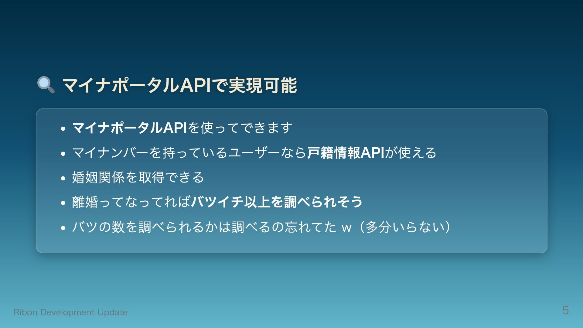 マイナポータルAPIで実現可能 マイナポータルAPIで実現可能 マイナポータルAPIを使ってできます マイナンバーを持っているユーザーなら戸籍情報APIが使える 婚姻関係を取得できる 離婚ってなってればバツイチ以上を調べられそう バツの数を調べられるかは調べるの忘れてた w(多分いらない) Ribon Development