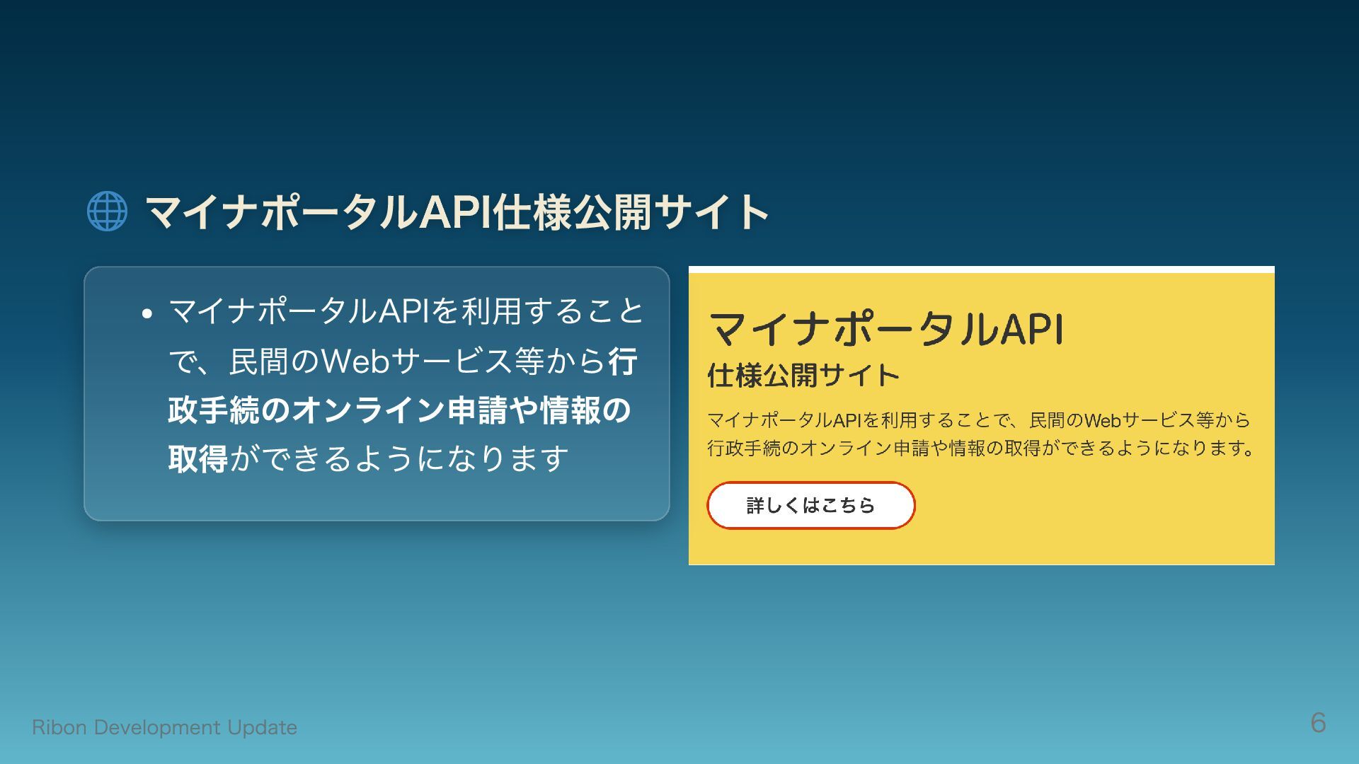 マイナポータルAPI仕様公開サイト マイナポータルAPI仕様公開サイト マイナポータルAPIを利用すること で、民間のWebサービス等から行 政手続のオンライン申請や情報の 取得ができるようになります Ribon Development Update 6