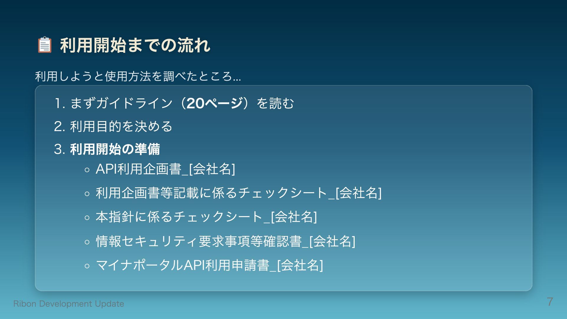 利用企画書等記載に係るチェックシート_[会社名] 本指針に係るチェックシート_[会社名] 情報セキュリティ要求事項等確認書_[会社名] マイナポータルAPI利用申請書_[会社名] Ribon Development Update 7