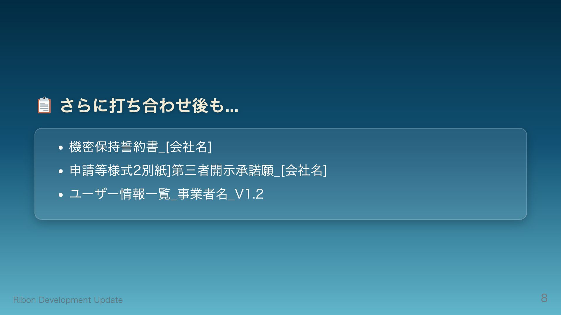 さらに打ち合わせ後も... さらに打ち合わせ後も... 機密保持誓約書_[会社名] 申請等様式2別紙]第三者開示承諾願_[会社名] ユーザー情報一覧_事業者名_V1.2 Ribon Development Update 8