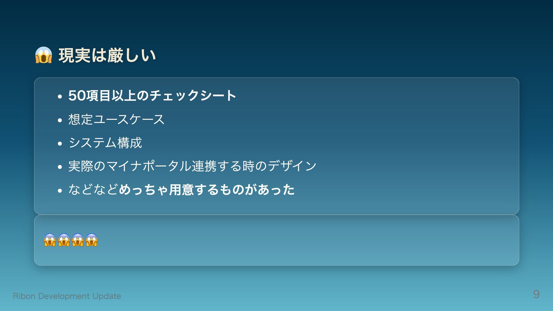 現実は厳しい 現実は厳しい 50項目以上のチェックシート 想定ユースケース システム構成 実際のマイナポータル連携する時のデザイン などなどめっちゃ用意するものがあった 😱😱😱😱 😱😱😱😱 Ribon