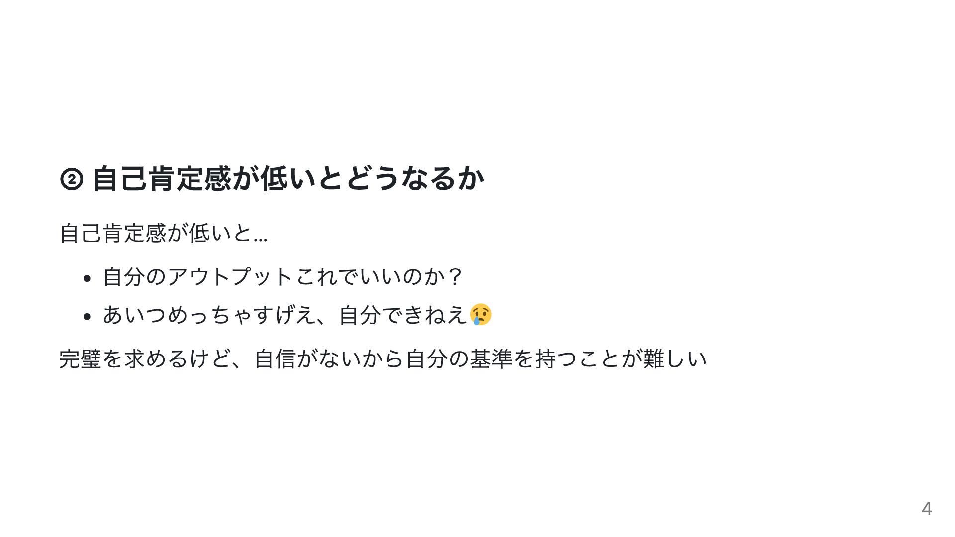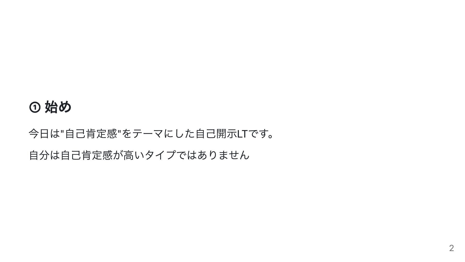 ① 始め 今日は"自己肯定感"をテーマにした自己開示LTです。 自分は自己肯定感が高いタイプではありません 2