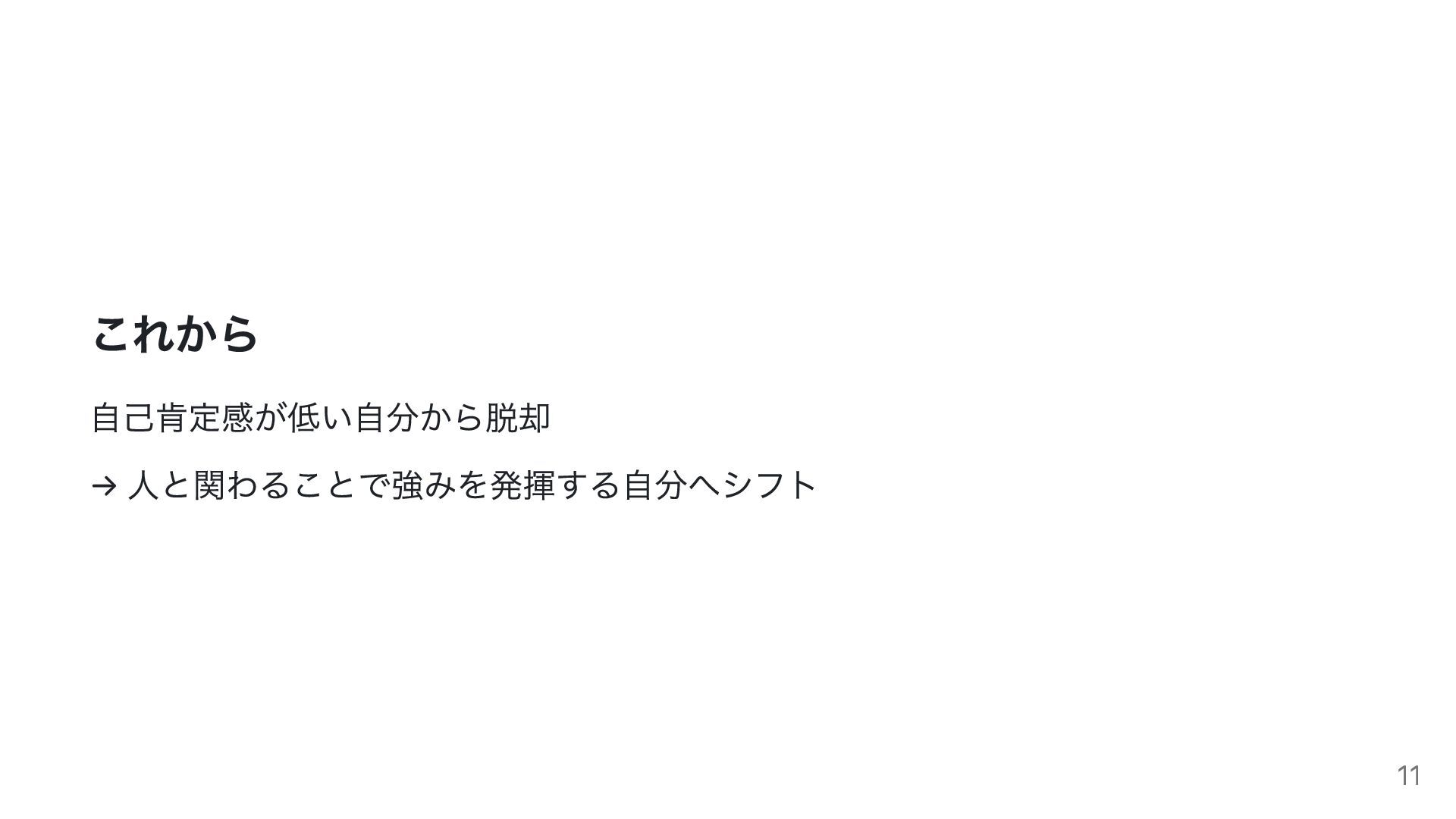 これから 自己肯定感が低い自分から脱却 → 人と関わることで強みを発揮する自分へシフト 11