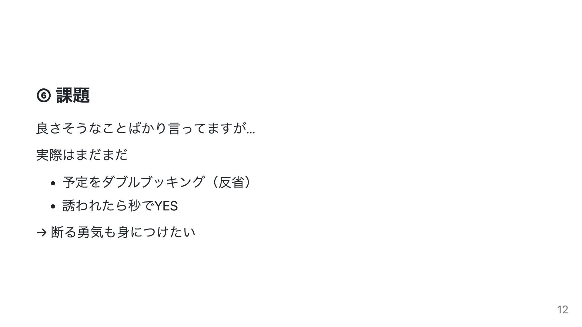 ⑥ 課題 良さそうなことばかり言ってますが... 実際はまだまだ 予定をダブルブッキング(反省) 誘われたら秒でYES → 断る勇気も身につけたい 12