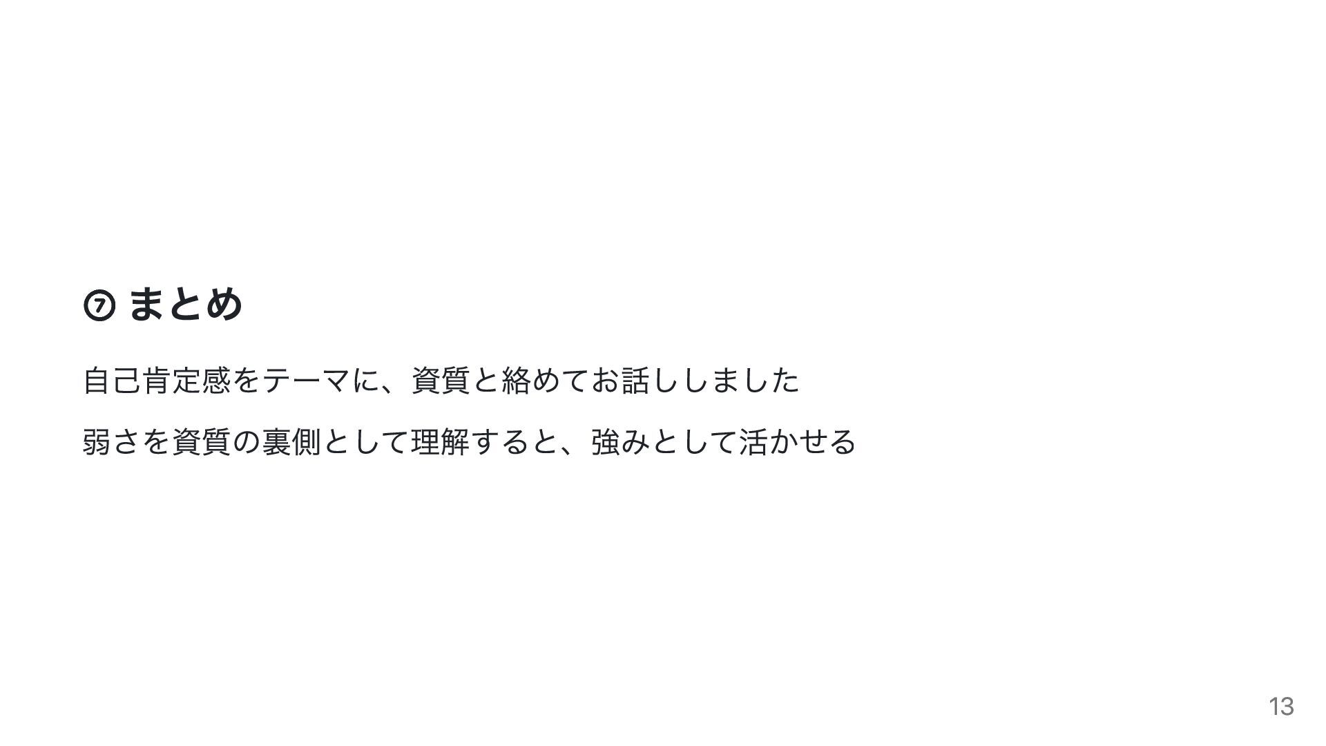 ⑦ まとめ 自己肯定感をテーマに、資質と絡めてお話ししました 弱さを資質の裏側として理解すると、強みとして活かせる 13