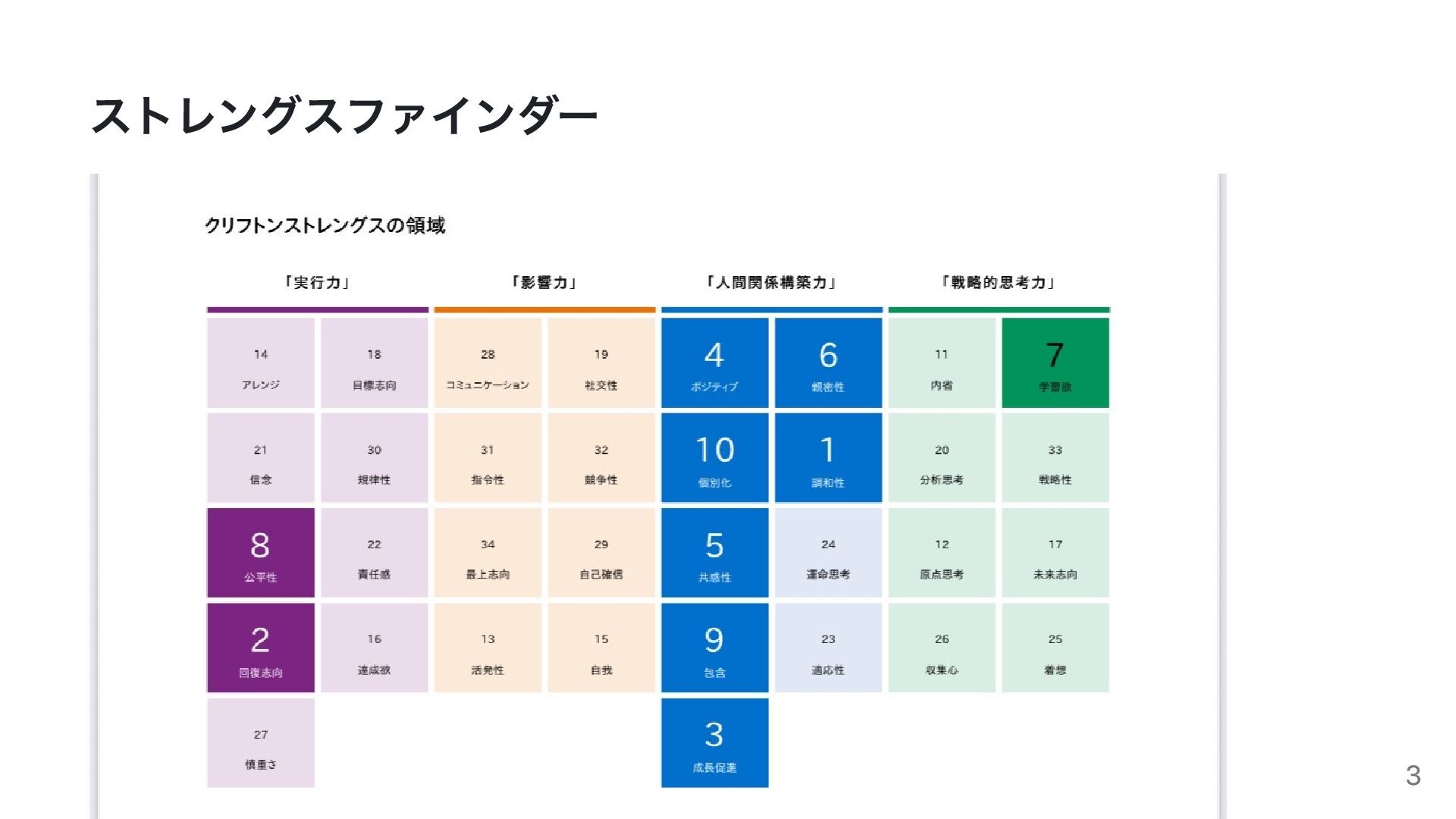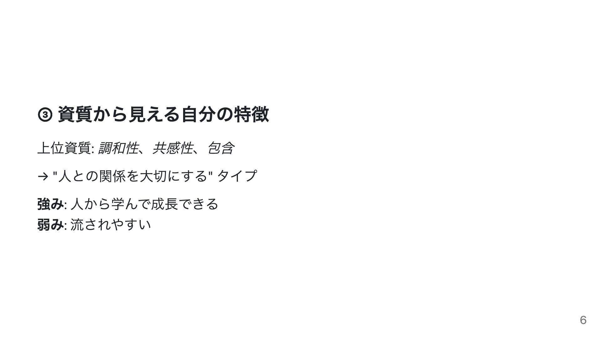 ③ 資質から見える自分の特徴 上位資質: 調和性、共感性、包含 → "人との関係を大切にする" タイプ 強み: 人から学んで成長できる 弱み: