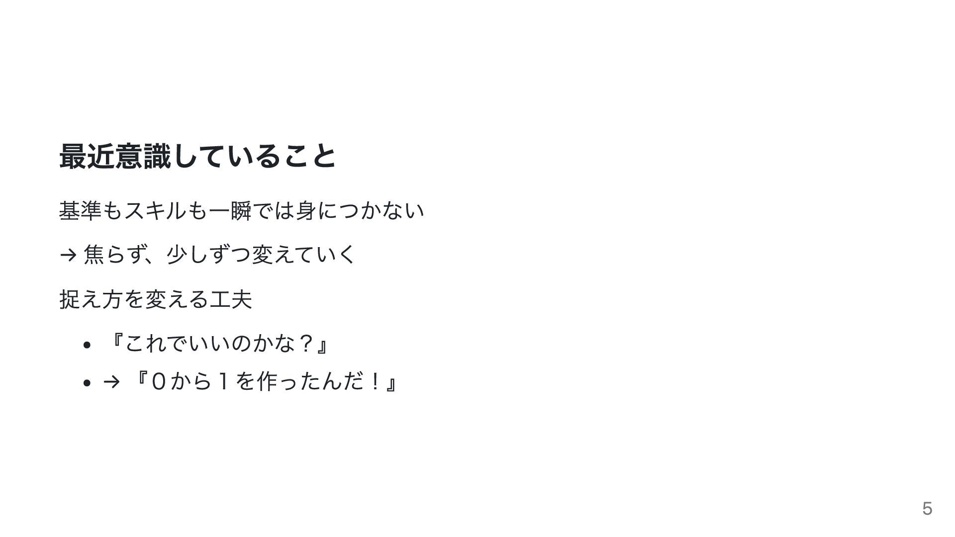 最近意識していること 基準もスキルも一瞬では身につかない → 焦らず、少しずつ変えていく 捉え方を変える工夫 『これでいいのかな?』 → 『0から1を作ったんだ!』 5