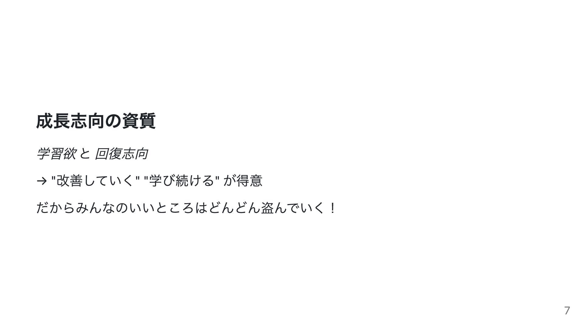 成長志向の資質 学習欲 と 回復志向 → "改善していく" "学び続ける" が得意 だからみんなのいいところはどんどん盗んでいく! 7