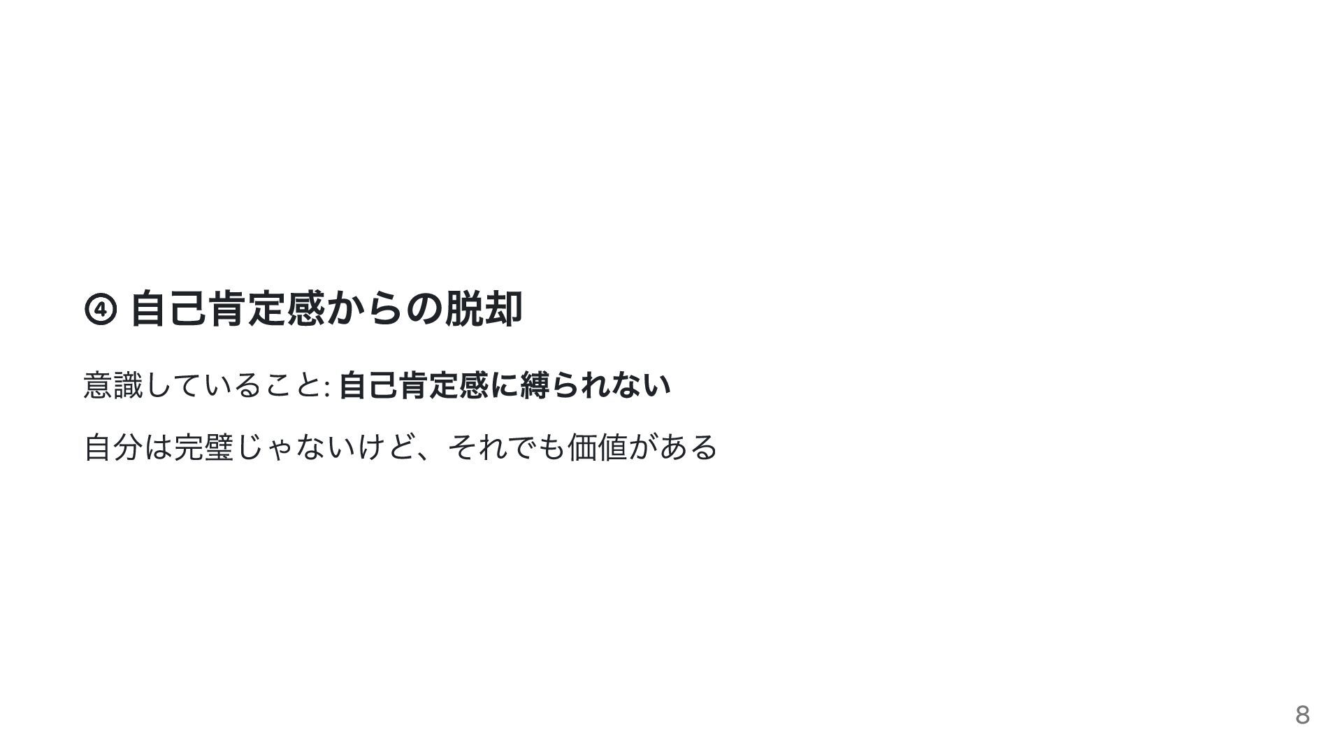④ 自己肯定感からの脱却 意識していること: 自己肯定感に縛られない 自分は完璧じゃないけど、それでも価値がある 8