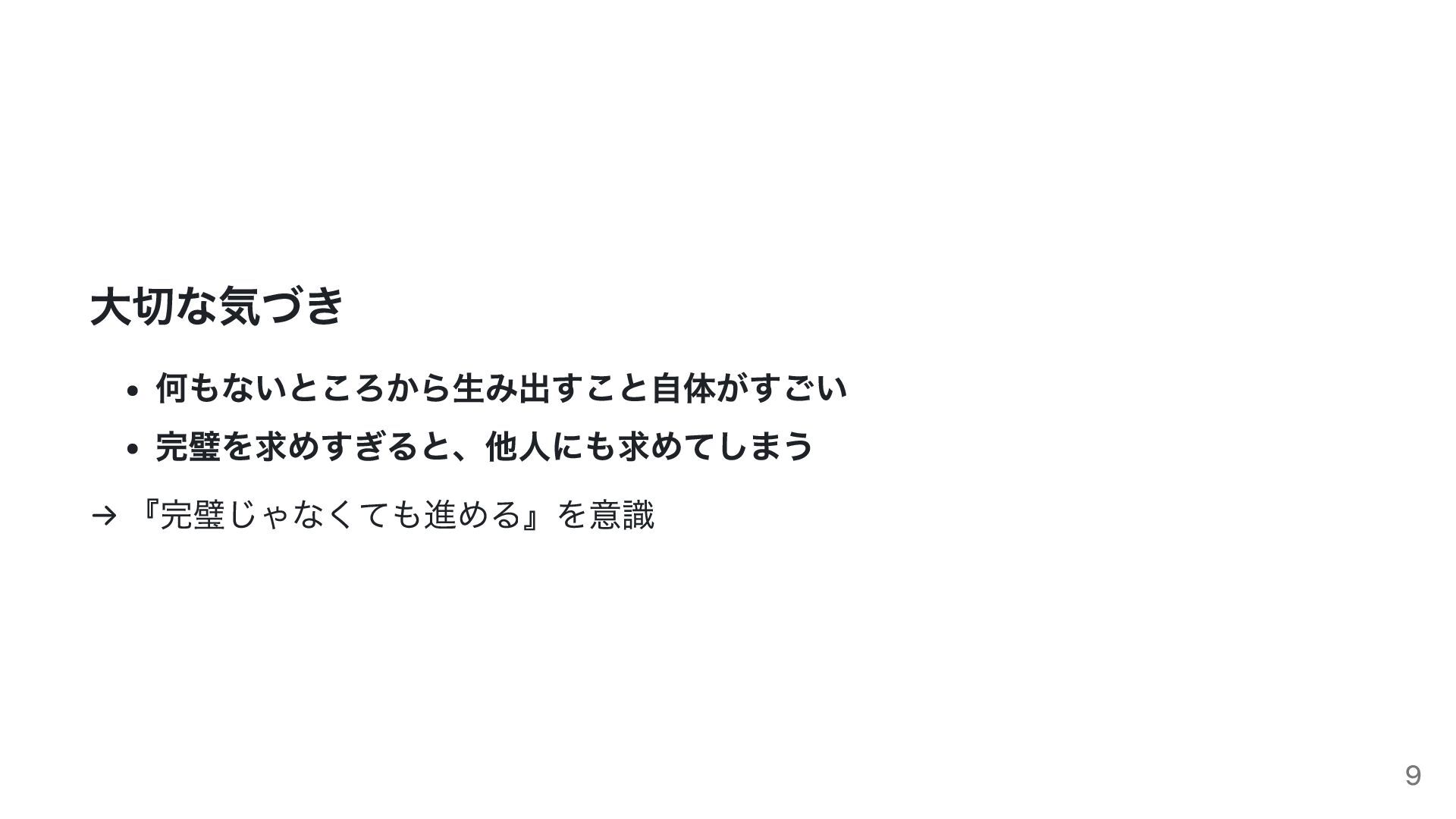 大切な気づき 何もないところから生み出すこと自体がすごい 完璧を求めすぎると、他人にも求めてしまう → 『完璧じゃなくても進める』を意識 9