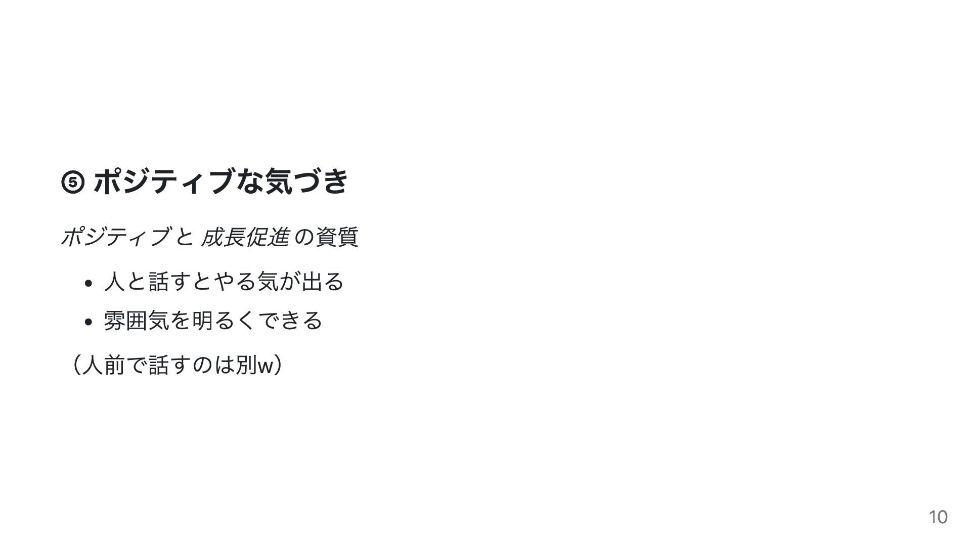 ⑤ ポジティブな気づき ポジティブ と 成長促進 の資質 人と話すとやる気が出る 雰囲気を明るくできる (人前で話すのは別w) 10