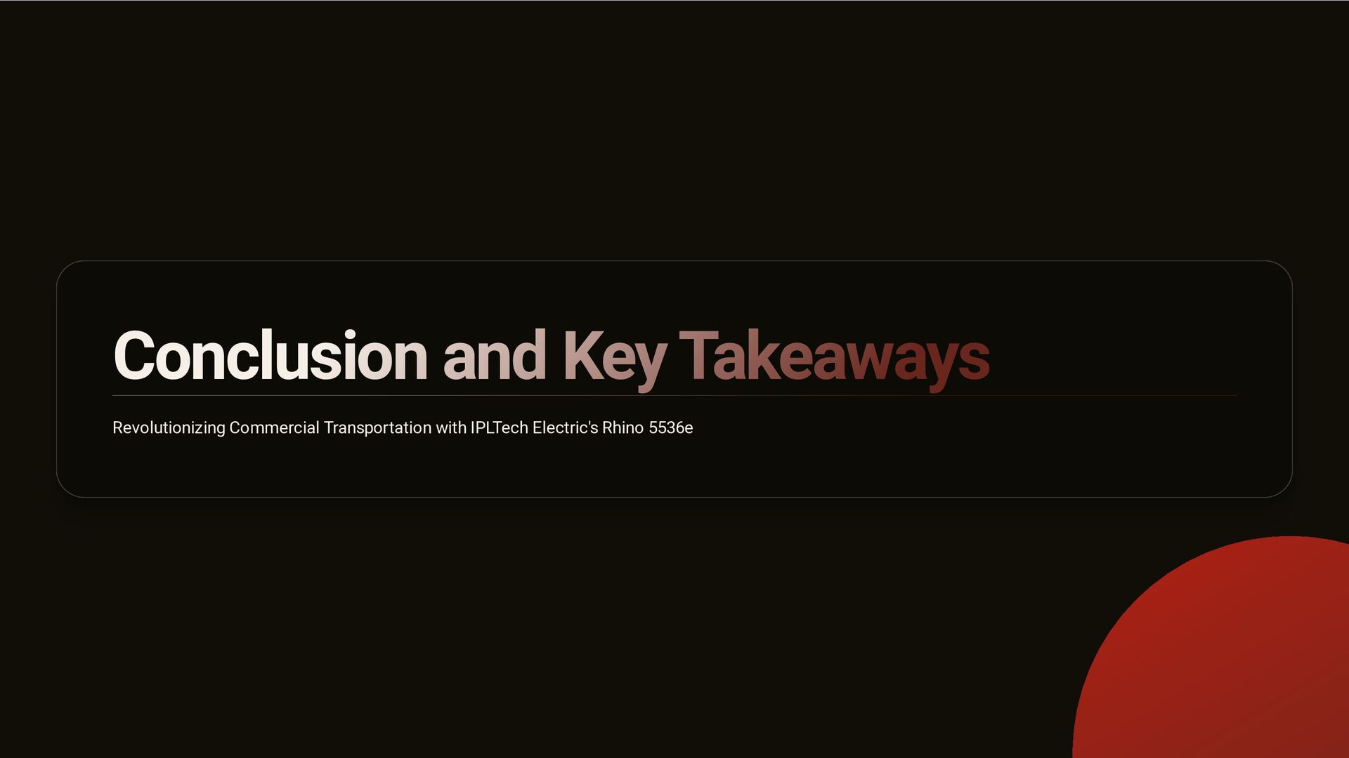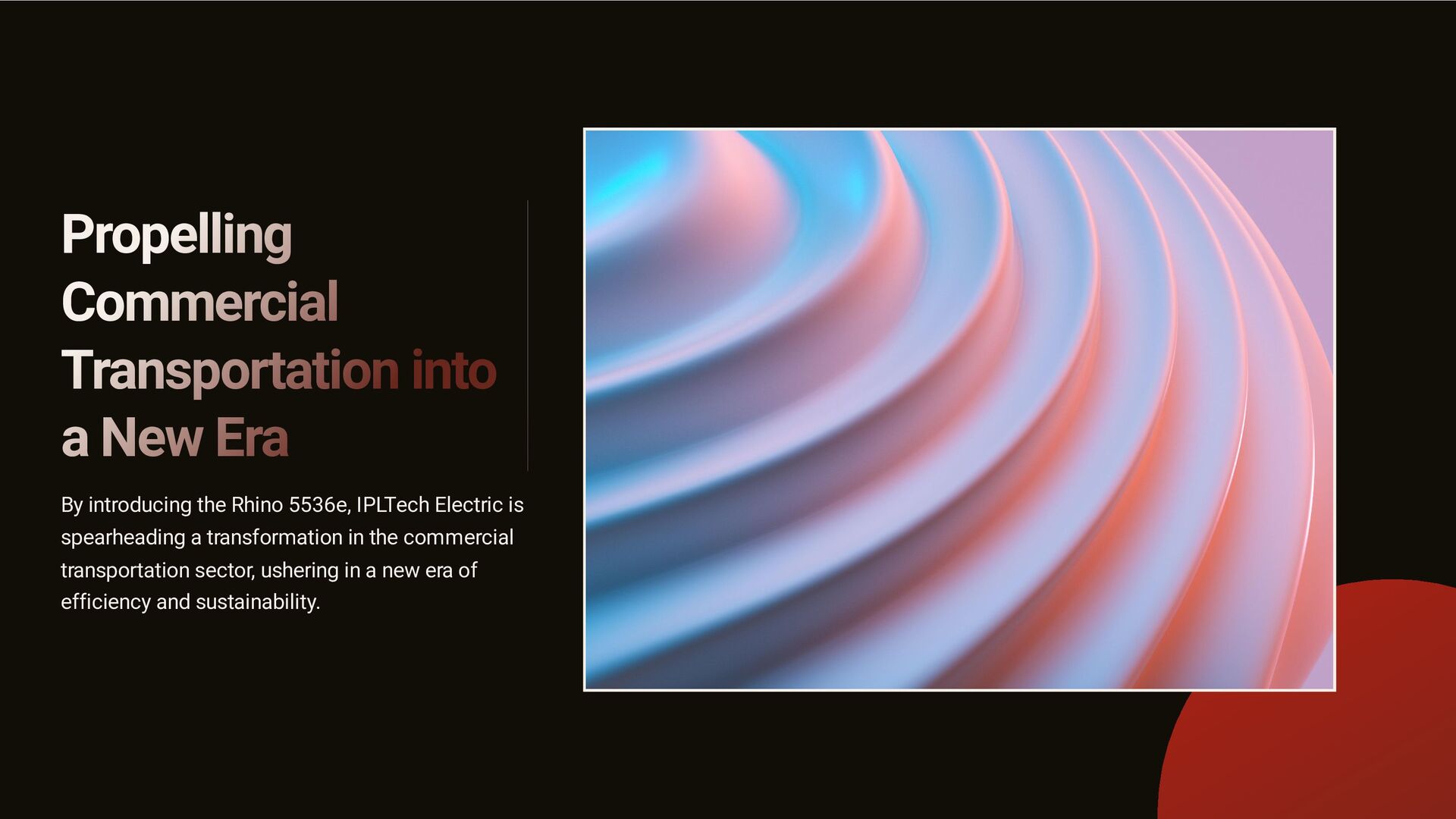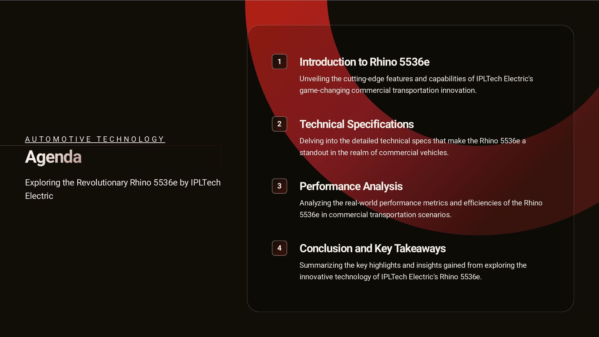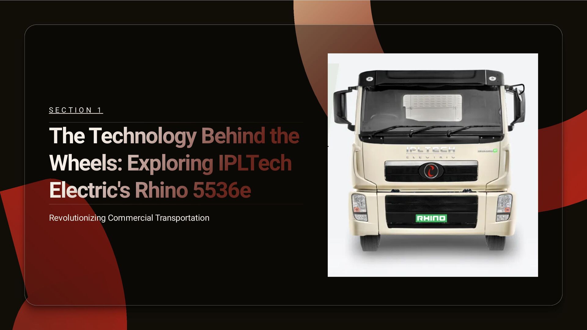 of IPLTech Electric's game-changing commercial transportation innovation. Technical Specifications Delving into the detailed technical specs that make the Rhino 5536e a standout in the realm of commercial vehicles. Performance Analysis Analyzing the real-world performance metrics and efficiencies of the Rhino 5536e in commercial transportation scenarios. Conclusion and Key Takeaways Summarizing the key highlights and insights gained from exploring the innovative technology of IPLTech Electric's Rhino 5536e. 1 2 3 4 Agenda Exploring the Revolutionary Rhino 5536e by IPLTech Electric A U T O M O T I V E T E C H N O L O G Y