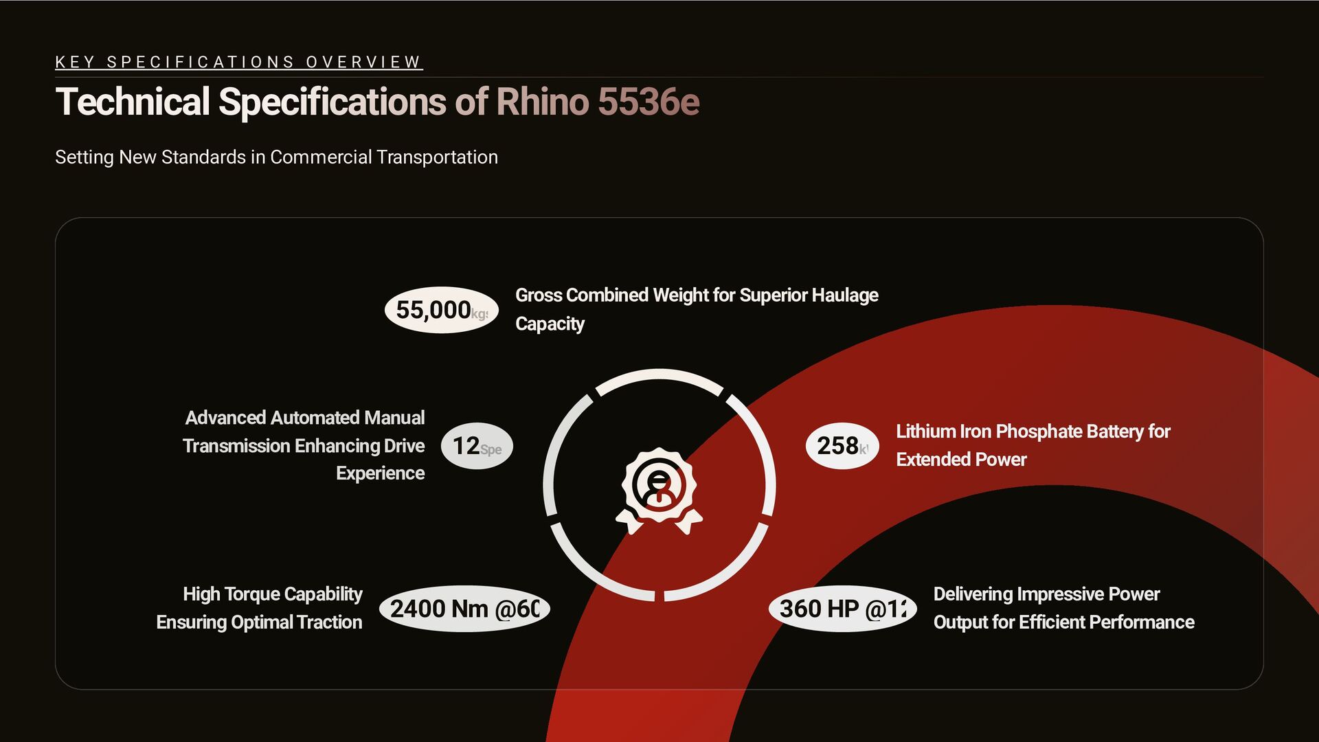 Battery for Extended Power Delivering Impressive Power Output for Efficient Performance High Torque Capability Ensuring Optimal Traction Advanced Automated Manual Transmission Enhancing Drive Experience 55,000kgs 258kW 360 HP @12 2400 Nm @60 12Spe Technical Specifications of Rhino 5536e Setting New Standards in Commercial Transportation K E Y S P E C I F I C A T I O N S O V E R V I E W