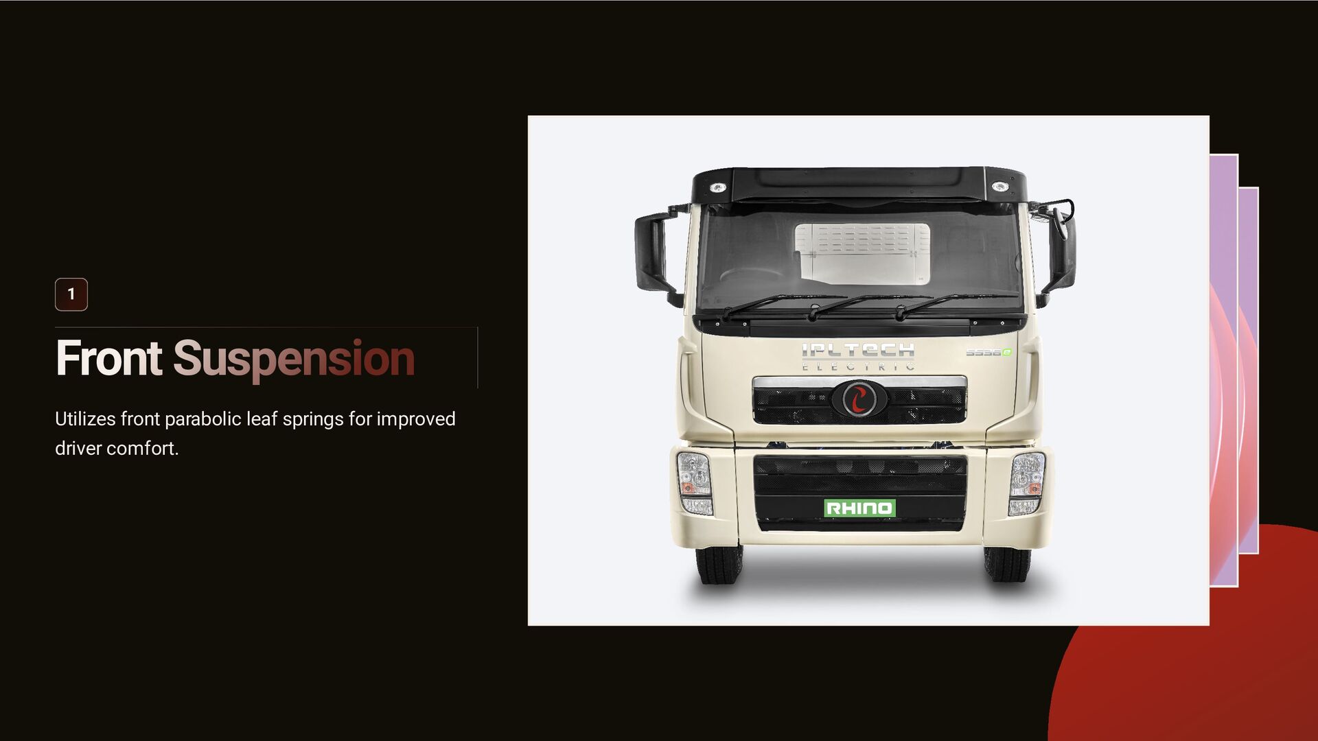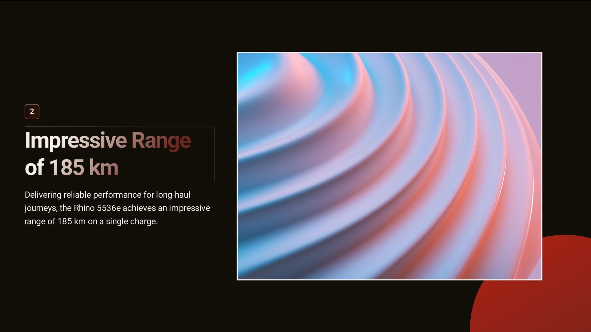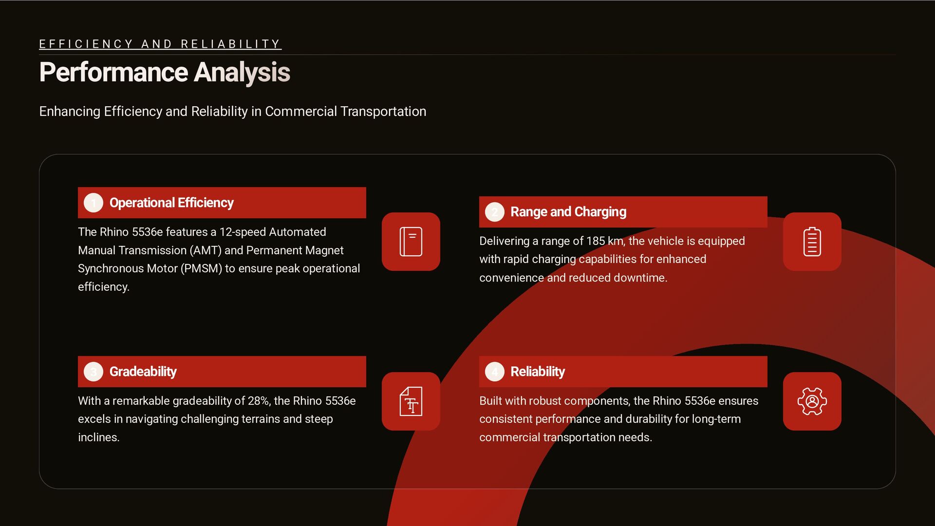 Transmission (AMT) and Permanent Magnet Synchronous Motor (PMSM) to ensure peak operational efficiency. 1 Range and Charging Delivering a range of 185 km, the vehicle is equipped with rapid charging capabilities for enhanced convenience and reduced downtime. 2 Gradeability With a remarkable gradeability of 28%, the Rhino 5536e excels in navigating challenging terrains and steep inclines. 3 Reliability Built with robust components, the Rhino 5536e ensures consistent performance and durability for long-term commercial transportation needs. 4 Performance Analysis Enhancing Efficiency and Reliability in Commercial Transportation E F F I C I E N C Y A N D R E L I A B I L I T Y