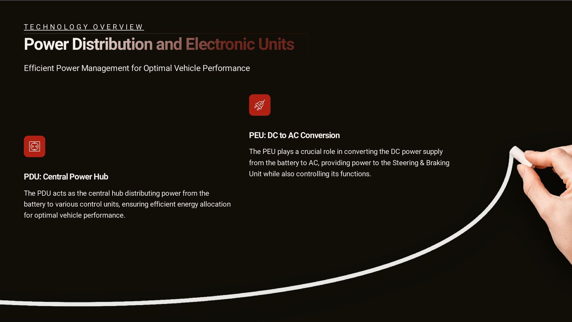 hub distributing power from the battery to various control units, ensuring efficient energy allocation for optimal vehicle performance. PEU: DC to AC Conversion The PEU plays a crucial role in converting the DC power supply from the battery to AC, providing power to the Steering & Braking Unit while also controlling its functions. Power Distribution and Electronic Units Efficient Power Management for Optimal Vehicle Performance T E C H N O L O G Y O V E R V I E W