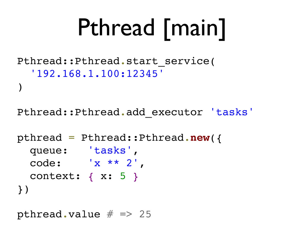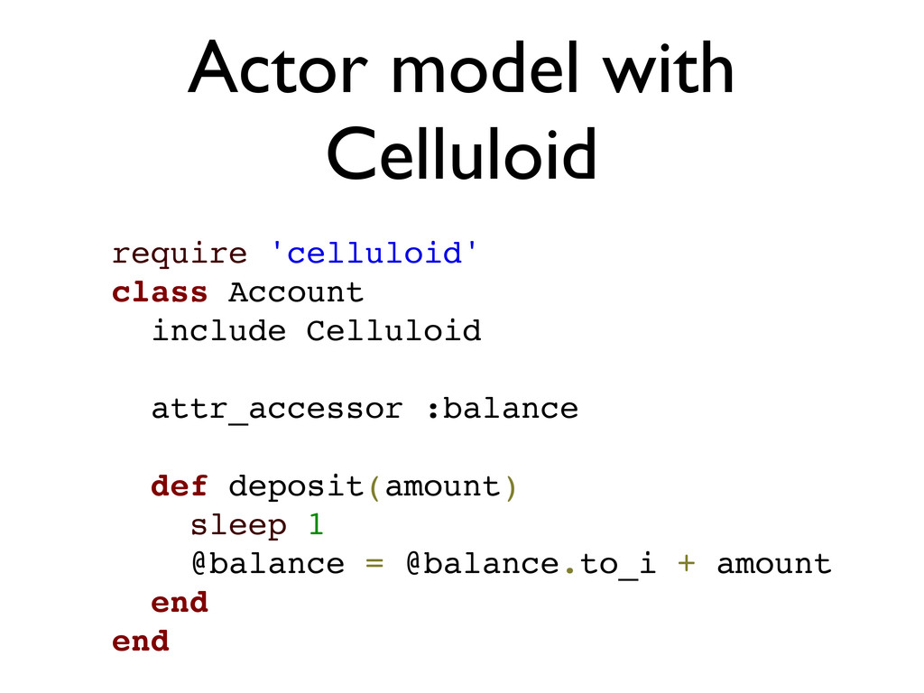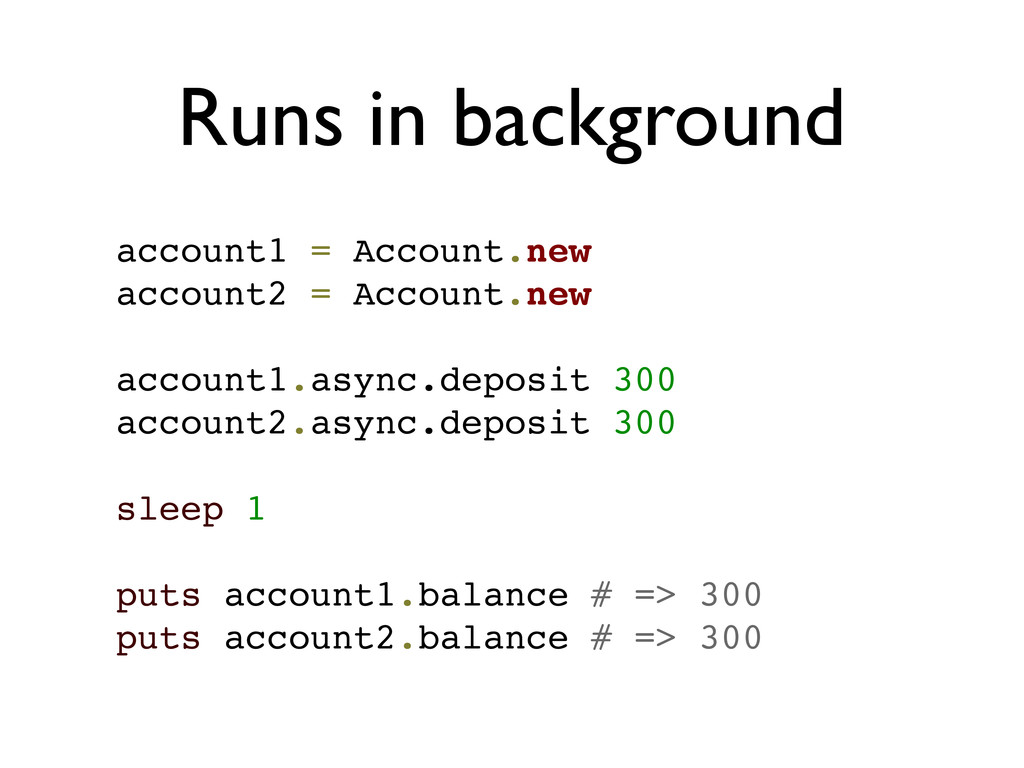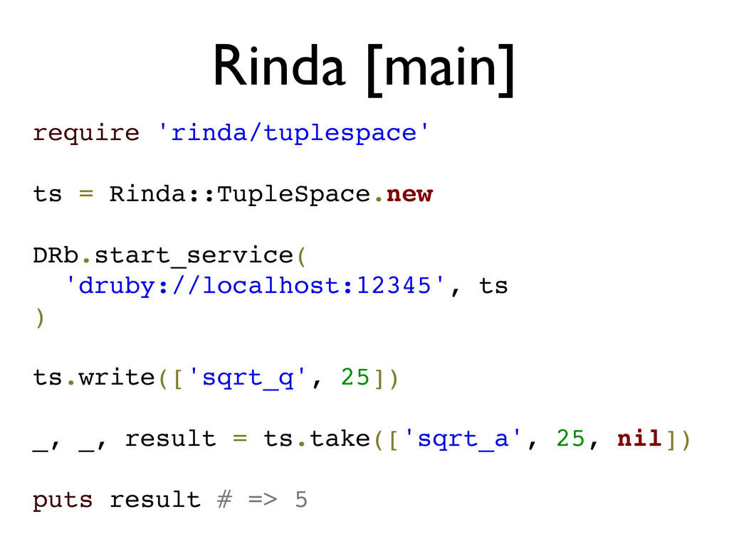 :balance def initialize(balance) @balance = balance end def withdraw(amount) if @balance >= amount @balance -= amount end end end DRb.start_service( 'druby://192.168.0.1:8787', Account.new(500) ) DRb.thread.join