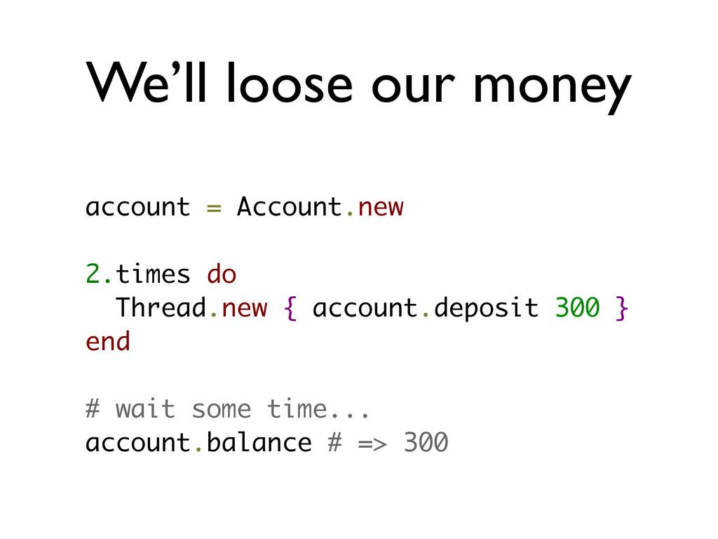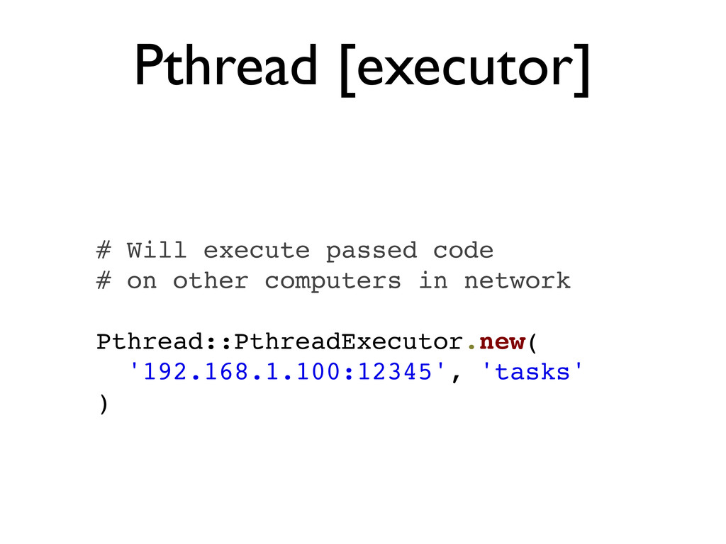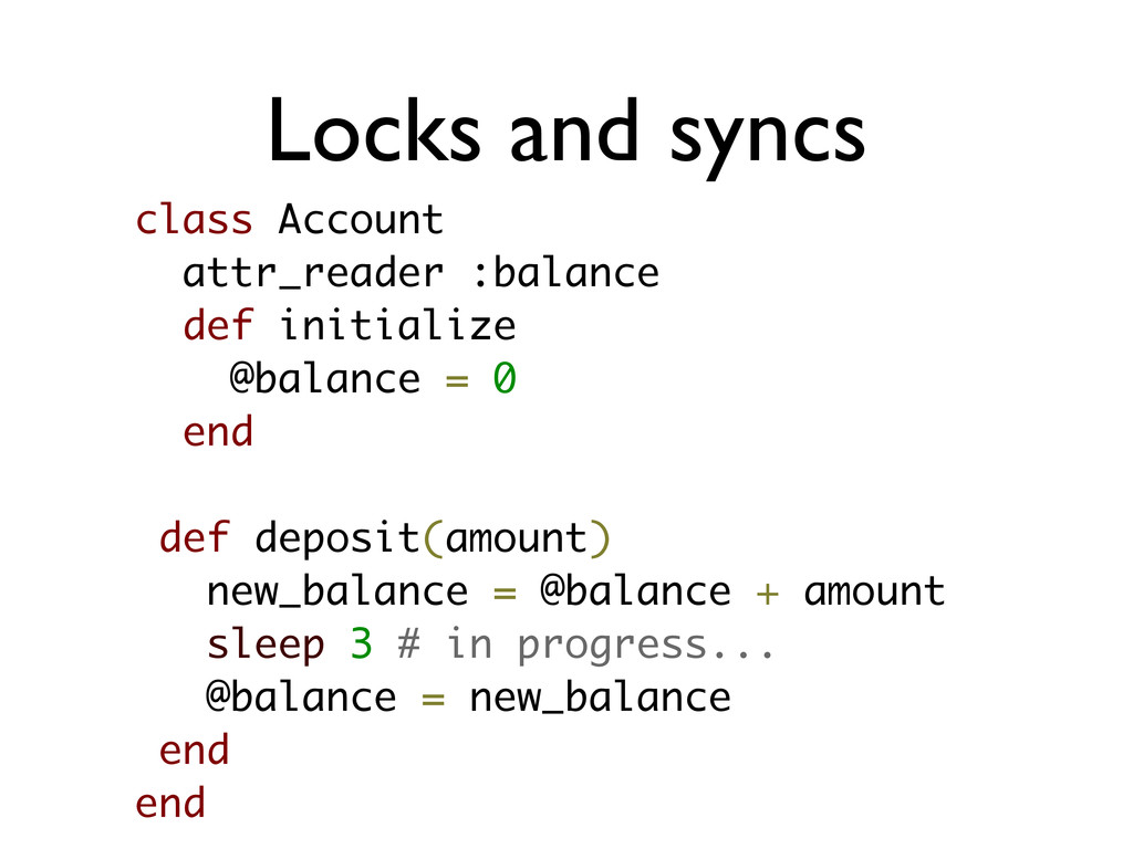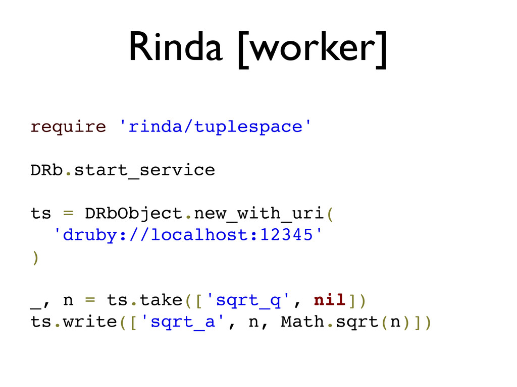 :balance def initialize(balance) @balance = balance end def withdraw(amount) if @balance >= amount @balance -= amount end end end DRb.start_service( 'druby://192.168.0.1:8787', Account.new(500) ) DRb.thread.join