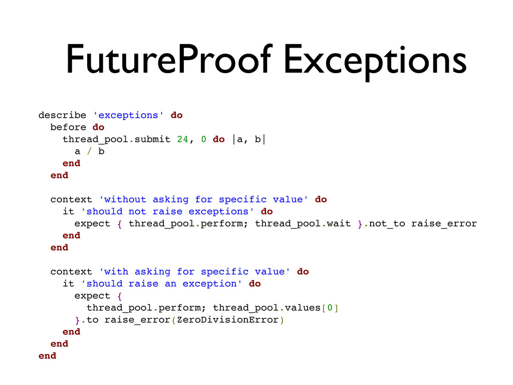 do |a, b| a / b end end context 'without asking for specific value' do it 'should not raise exceptions' do expect { thread_pool.perform; thread_pool.wait }.not_to raise_error end end context 'with asking for specific value' do it 'should raise an exception' do expect { thread_pool.perform; thread_pool.values[0] }.to raise_error(ZeroDivisionError) end end end