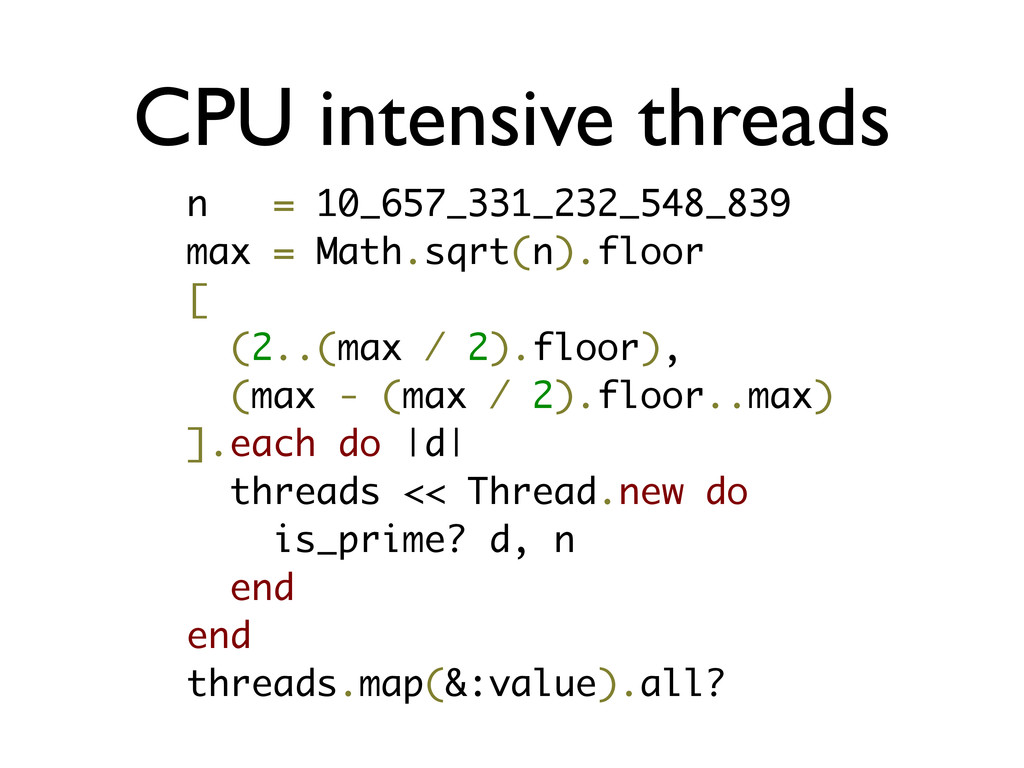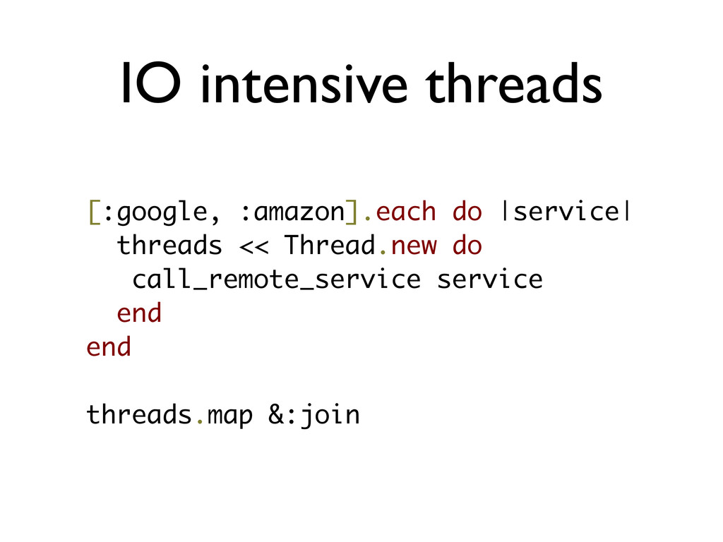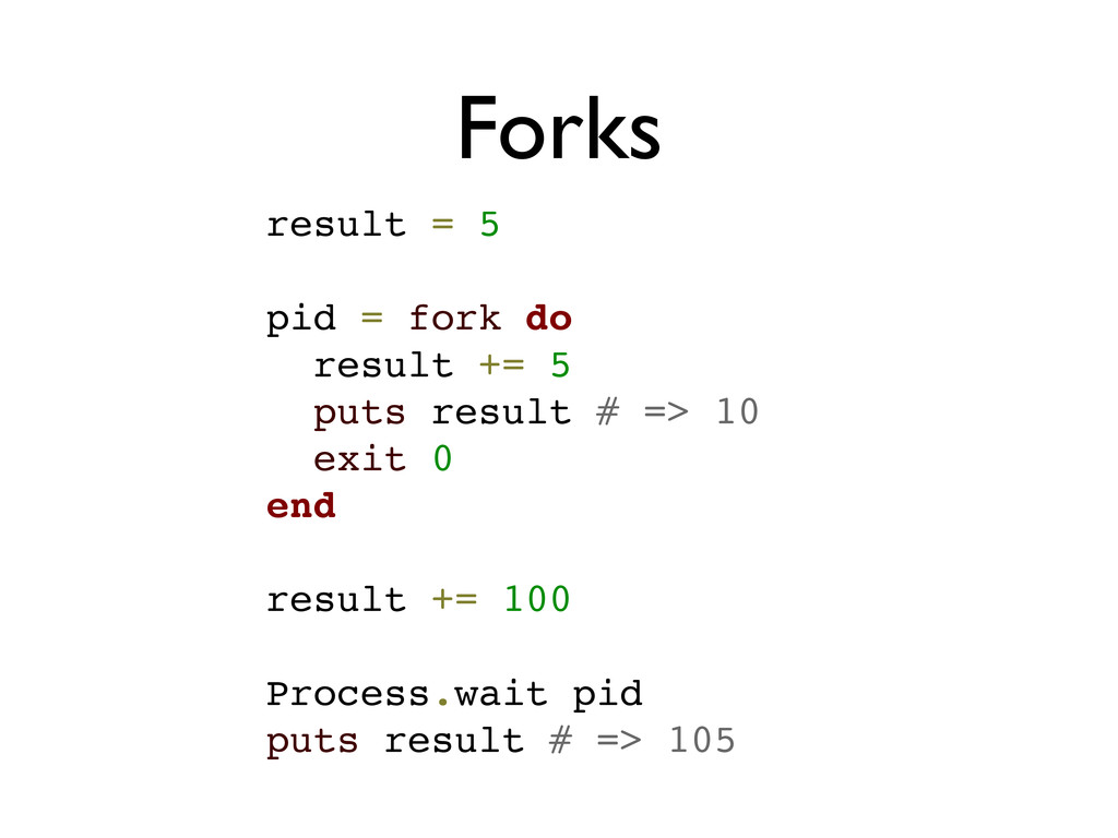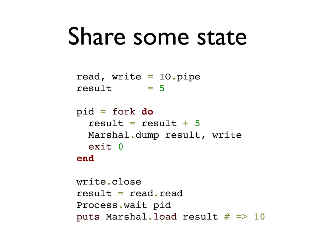 pid = fork do result = result + 5 Marshal.dump result, write exit 0 end write.close result = read.read Process.wait pid puts Marshal.load result # => 10