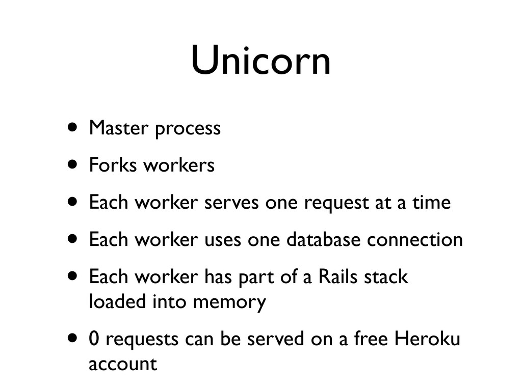 serves one request at a time • Each worker uses one database connection • Each worker has part of a Rails stack loaded into memory • 0 requests can be served on a free Heroku account