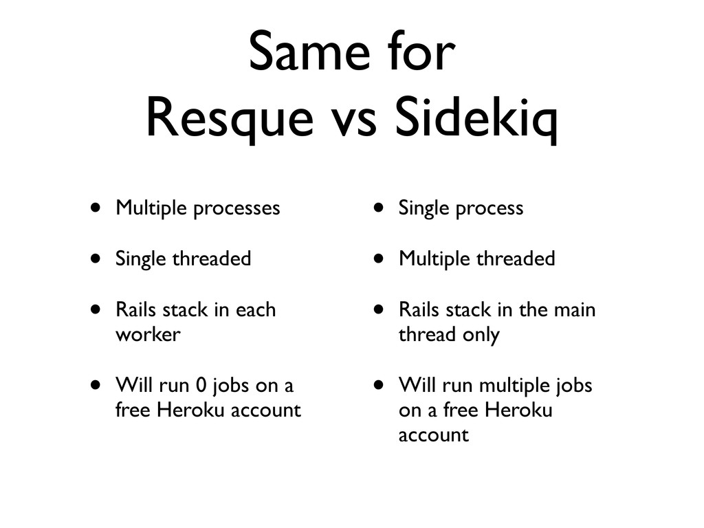 threaded • Rails stack in each worker • Will run 0 jobs on a free Heroku account • Single process • Multiple threaded • Rails stack in the main thread only • Will run multiple jobs on a free Heroku account