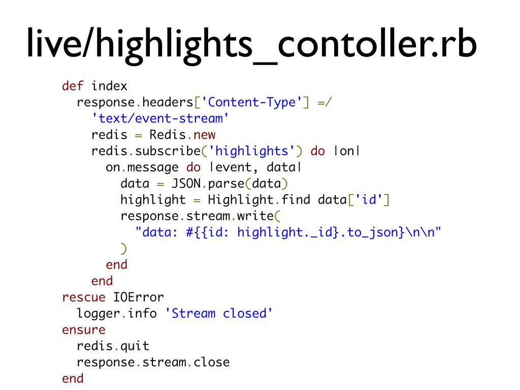 do |on| on.message do |event, data| data = JSON.parse(data) highlight = Highlight.find data['id'] response.stream.write( "data: #{{id: highlight._id}.to_json}\n\n" ) end end rescue IOError logger.info 'Stream closed' ensure redis.quit response.stream.close end