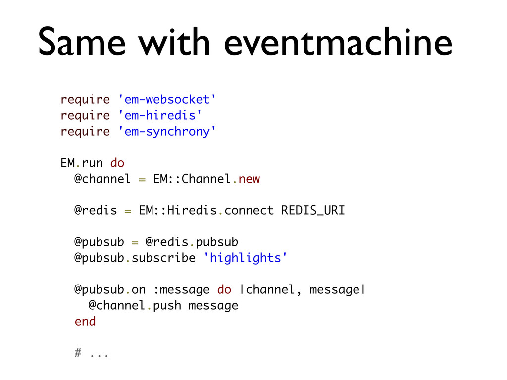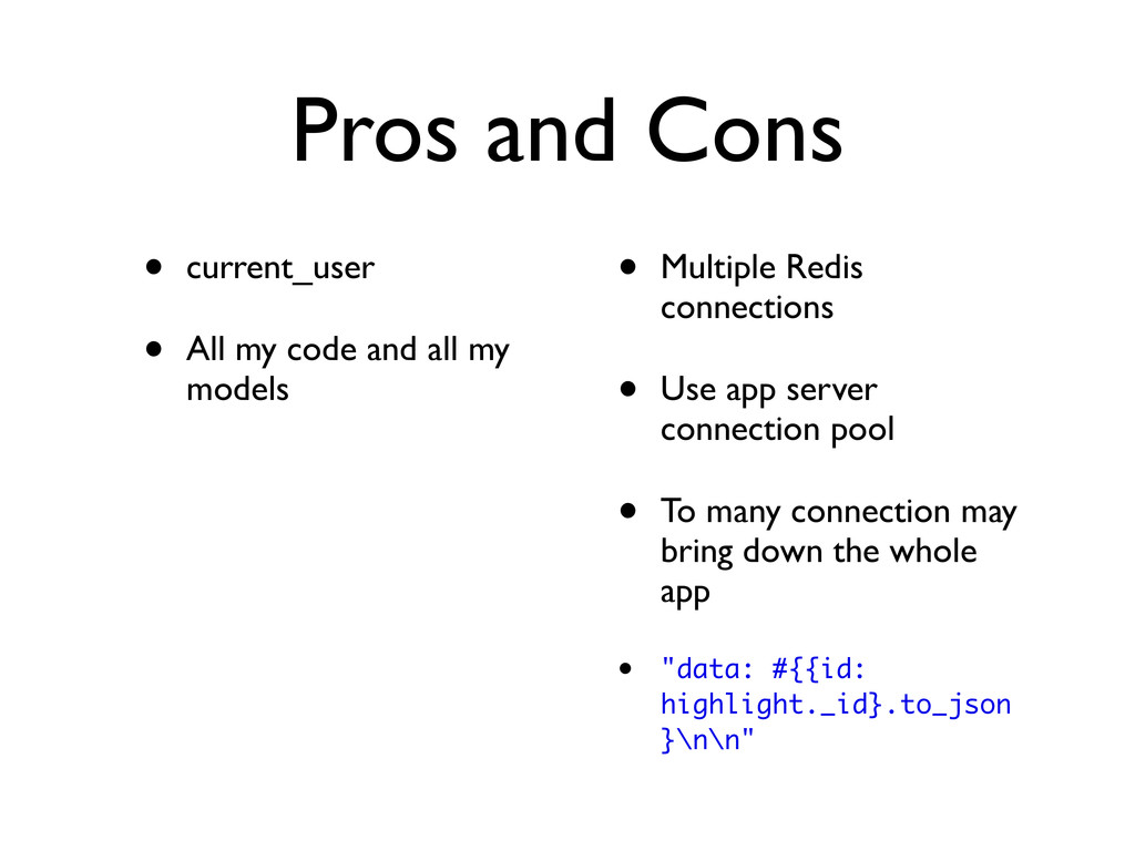 all my models • Multiple Redis connections • Use app server connection pool • To many connection may bring down the whole app • "data: #{{id: highlight._id}.to_json }\n\n"