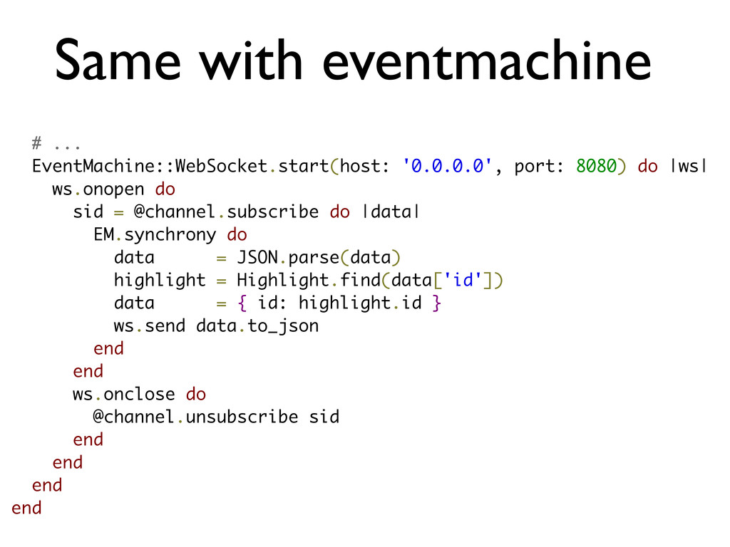 |ws| ws.onopen do sid = @channel.subscribe do |data| EM.synchrony do data = JSON.parse(data) highlight = Highlight.find(data['id']) data = { id: highlight.id } ws.send data.to_json end end ws.onclose do @channel.unsubscribe sid end end end end