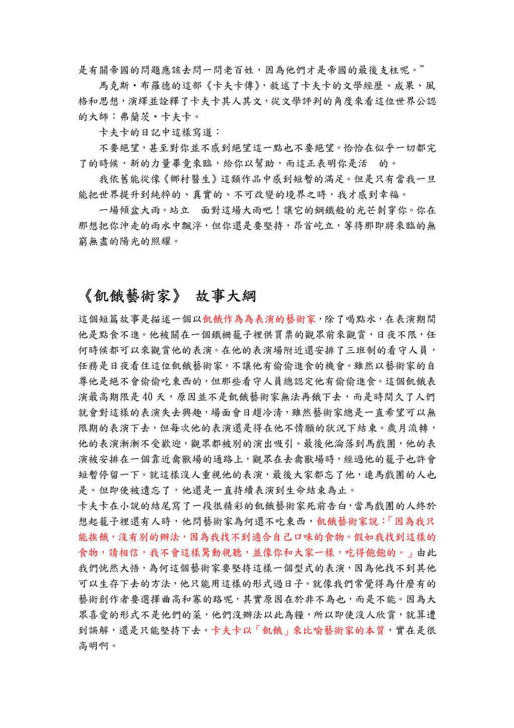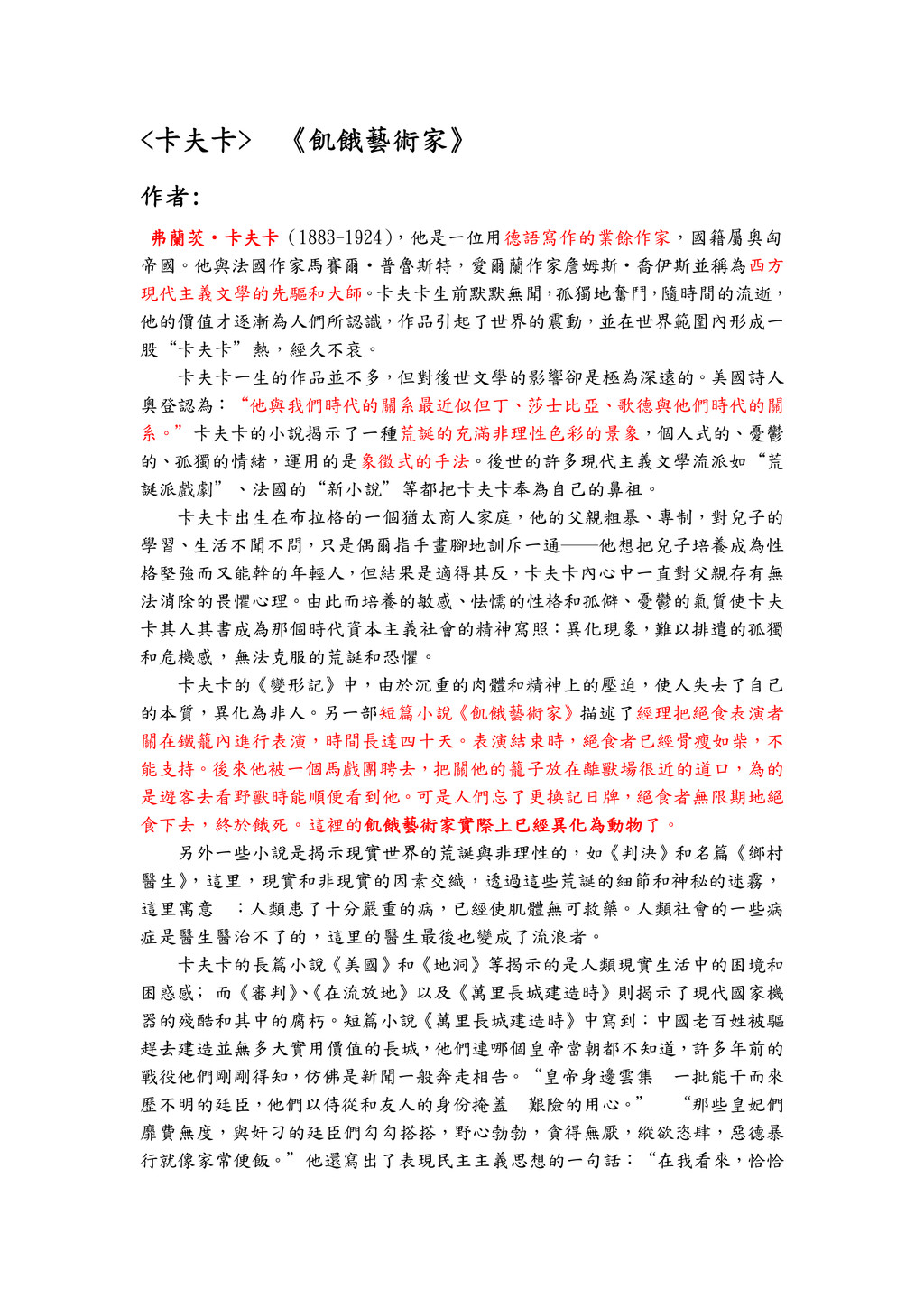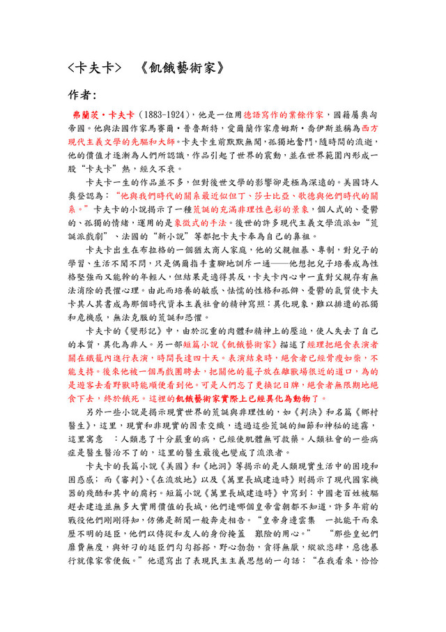 《 《 《 《飢餓藝術家 飢餓藝術家 飢餓藝術家 飢餓藝術家》 》 》 》 作者 作者 作者 作者: : : : 弗蘭茨 弗蘭茨 弗蘭茨 弗蘭茨‧ ‧ ‧ ‧卡夫卡 卡夫卡 卡夫卡 卡夫卡(1883-1924) ,他是一位用德語寫作的業餘作家,國籍屬奧匈 帝國。他與法國作家馬賽爾‧普魯斯特,愛爾蘭作家詹姆斯‧喬伊斯並稱為西方 現代主義文學的先驅和大師。卡夫卡生前默默無聞,孤獨地奮鬥,隨時間的流逝, 他的價值才逐漸為人們所認識,作品引起了世界的震動,並在世界範圍內形成一 股“卡夫卡”熱,經久不衰。 卡夫卡一生的作品並不多,但對後世文學的影響卻是極為深遠的。美國詩人 奧登認為:“他與我們時代的關系最近似但丁、莎士比亞、歌德與他們時代的關 系。”卡夫卡的小說揭示了一種荒誕的充滿非理性色彩的景象,個人式的、憂鬱 的、孤獨的情緒,運用的是象徵式的手法。後世的許多現代主義文學流派如“荒 誕派戲劇”、法國的“新小說”等都把卡夫卡奉為自己的鼻祖。 卡夫卡出生在布拉格的一個猶太商人家庭,他的父親粗暴、專制,對兒子的 學習、生活不聞不問,只是偶爾指手畫腳地訓斥一通──他想把兒子培養成為性 格堅強而又能幹的年輕人,但結果是適得其反,卡夫卡內心中一直對父親存有無 法消除的畏懼心理。由此而培養的敏感、怯懦的性格和孤僻、憂鬱的氣質使卡夫 卡其人其書成為那個時代資本主義社會的精神寫照:異化現象,難以排遣的孤獨 和危機感,無法克服的荒誕和恐懼。 卡夫卡的《變形記》中,由於沉重的肉體和精神上的壓迫,使人失去了自己 的本質,異化為非人。另一部短篇小說《飢餓藝術家》描述了經理把絕食表演者 關在鐵籠內進行表演,時間長達四十天。表演結束時,絕食者已經骨瘦如柴,不 能支持。後來他被一個馬戲團聘去,把關他的籠子放在離獸場很近的道口,為的 是遊客去看野獸時能順便看到他。可是人們忘了更換記日牌,絕食者無限期地絕 食下去,終於餓死。這裡的飢餓藝術家實際上已經異化為動物 飢餓藝術家實際上已經異化為動物 飢餓藝術家實際上已經異化為動物 飢餓藝術家實際上已經異化為動物了。 另外一些小說是揭示現實世界的荒誕與非理性的,如《判決》和名篇《鄉村 醫生》 ,這里,現實和非現實的因素交織,透過這些荒誕的細節和神秘的迷霧, 這里寓意:人類患了十分嚴重的病,已經使肌體無可救藥。人類社會的一些病 症是醫生醫治不了的,這里的醫生最後也變成了流浪者。 卡夫卡的長篇小說《美國》和《地洞》等揭示的是人類現實生活中的困境和 困惑感﹔而《審判》 、 《在流放地》以及《萬里長城建造時》則揭示了現代國家機 器的殘酷和其中的腐朽。短篇小說《萬里長城建造時》中寫到:中國老百姓被驅 趕去建造並無多大實用價值的長城,他們連哪個皇帝當朝都不知道,許多年前的 戰役他們剛剛得知,仿佛是新聞一般奔走相告。“皇帝身邊雲集一批能干而來 歷不明的廷臣,他們以侍從和友人的身份掩蓋艱險的用心。” “那些皇妃們 靡費無度,與奸刁的廷臣們勾勾搭搭,野心勃勃,貪得無厭,縱欲恣肆,惡德暴 行就像家常便飯。”他還寫出了表現民主主義思想的一句話:“在我看來,恰恰