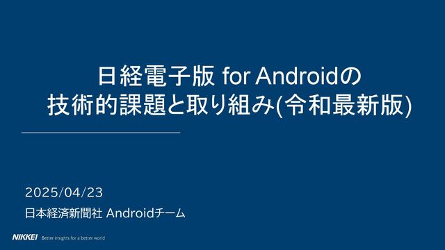 2025年4月23日開催、【Androidエンジニア特集】Androidアプリ開発 開発組織が向き合う課題と戦略 という技術イベントに日本経済新聞社のAndroidチーム 尾形さんが登壇。発表スライドです。タイトルは「日経電子版 for Android の技術的課題と取り組み」です