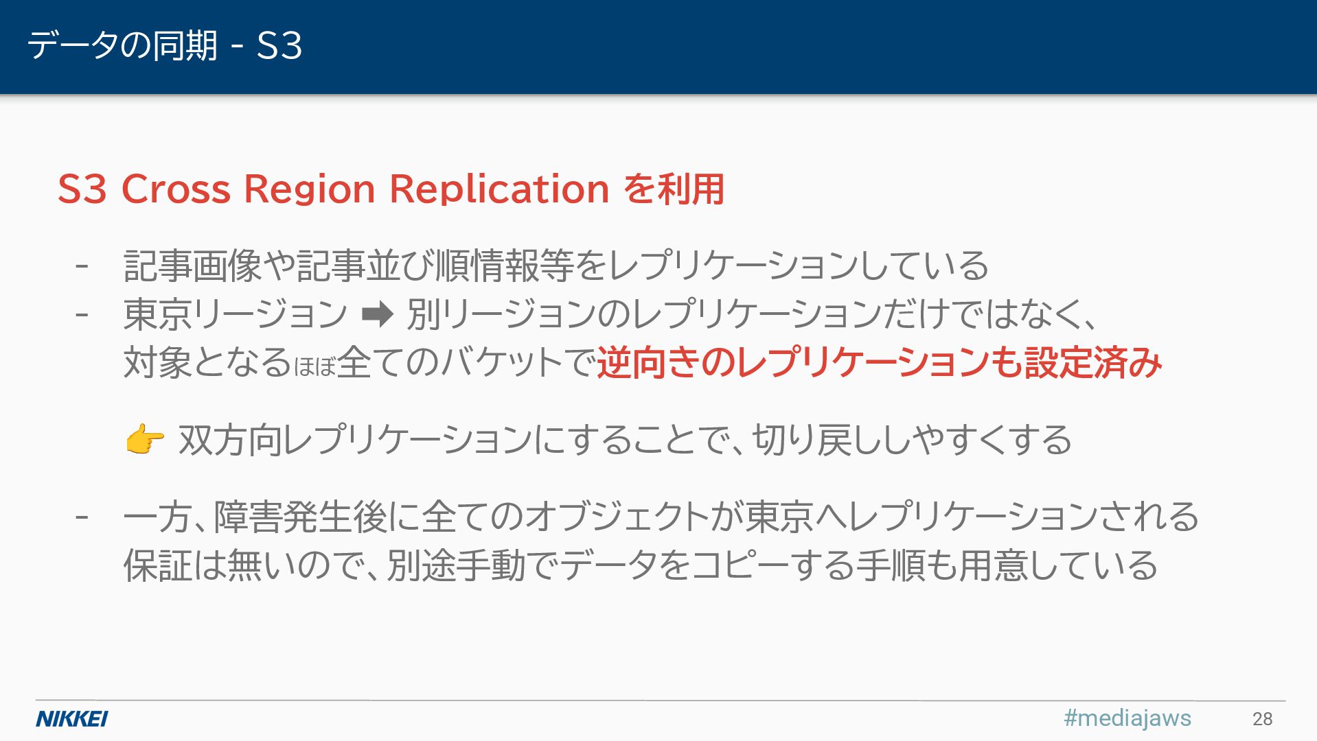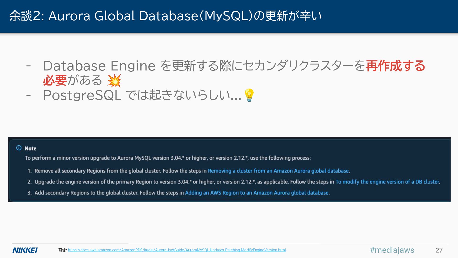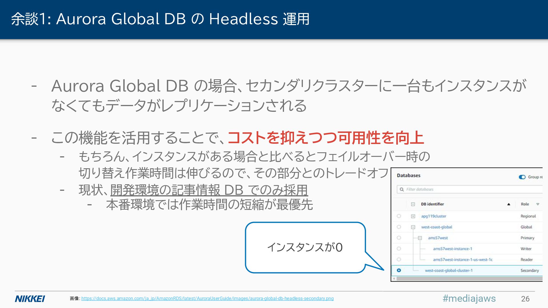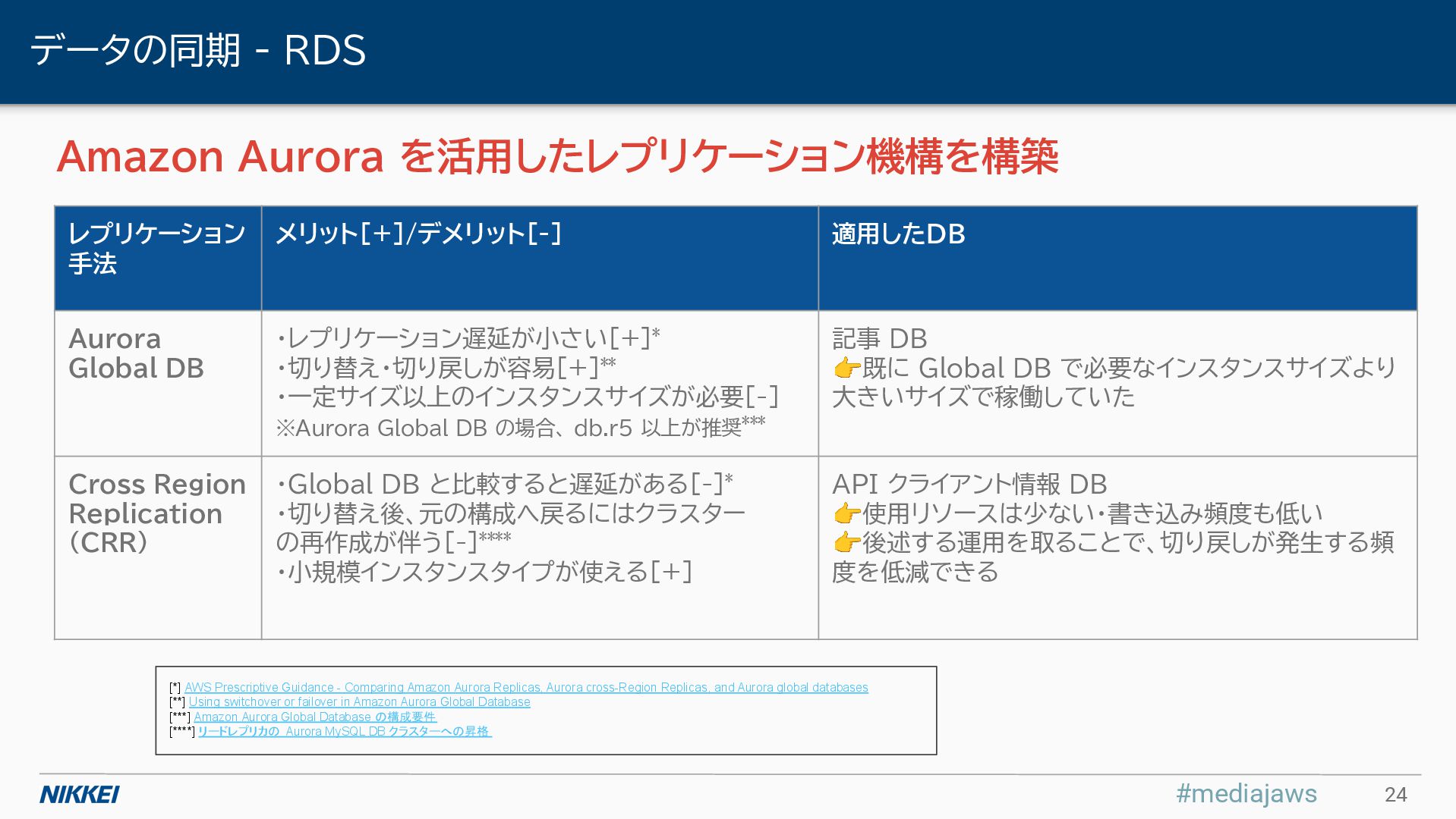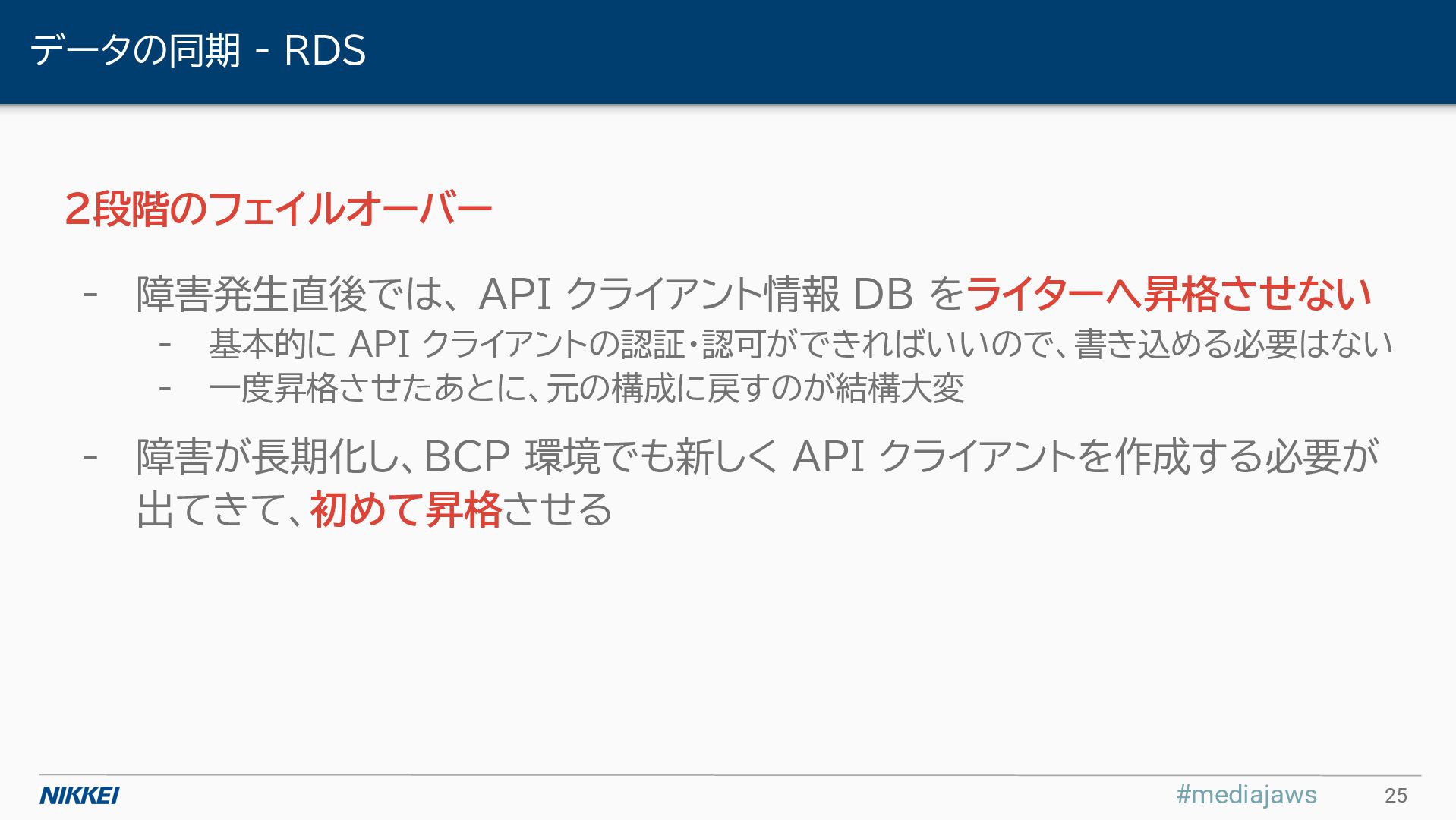 適用したDB Aurora Global DB ・レプリケーション遅延が小さい[+]* ・切り替え・切り戻しが容易[+]** ・一定サイズ以上のインスタンスサイズが必要[-] ※Aurora Global DB の場合、 db.r5 以上が推奨*** 記事 DB 👉既に Global DB で必要なインスタンスサイズより 大きいサイズで稼働していた Cross Region Replication (CRR) ・Global DB と比較すると遅延がある[-]* ・切り替え後、元の構成へ戻るにはクラスター の再作成が伴う[-]**** ・小規模インスタンスタイプが使える[+] API クライアント情報 DB 👉使用リソースは少ない・書き込み頻度も低い 👉後述する運用を取ることで、切り戻しが発生する頻 度を低減できる 24 [*] AWS Prescriptive Guidance - Comparing Amazon Aurora Replicas, Aurora cross-Region Replicas, and Aurora global databases [**] Using switchover or failover in Amazon Aurora Global Database [***] Amazon Aurora Global Database の構成要件 [****] リードレプリカの Aurora MySQL DB クラスターへの昇格