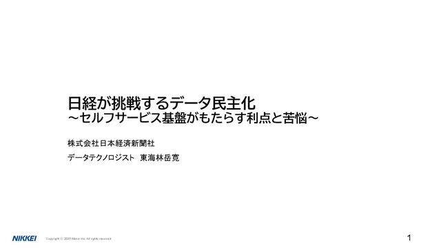 2025/9/25開催 NIKKEI Tech Talk #37 ( #nikkei_tech_talk )にて日本経済新聞社のエンジニア 東海林 岳寛さんが発表しました。発表タイトルは「日経が挑戦するデータ民主化 ~セルフサービス基盤がもたらす利点と苦悩~」です nikkei-tech-talk-37