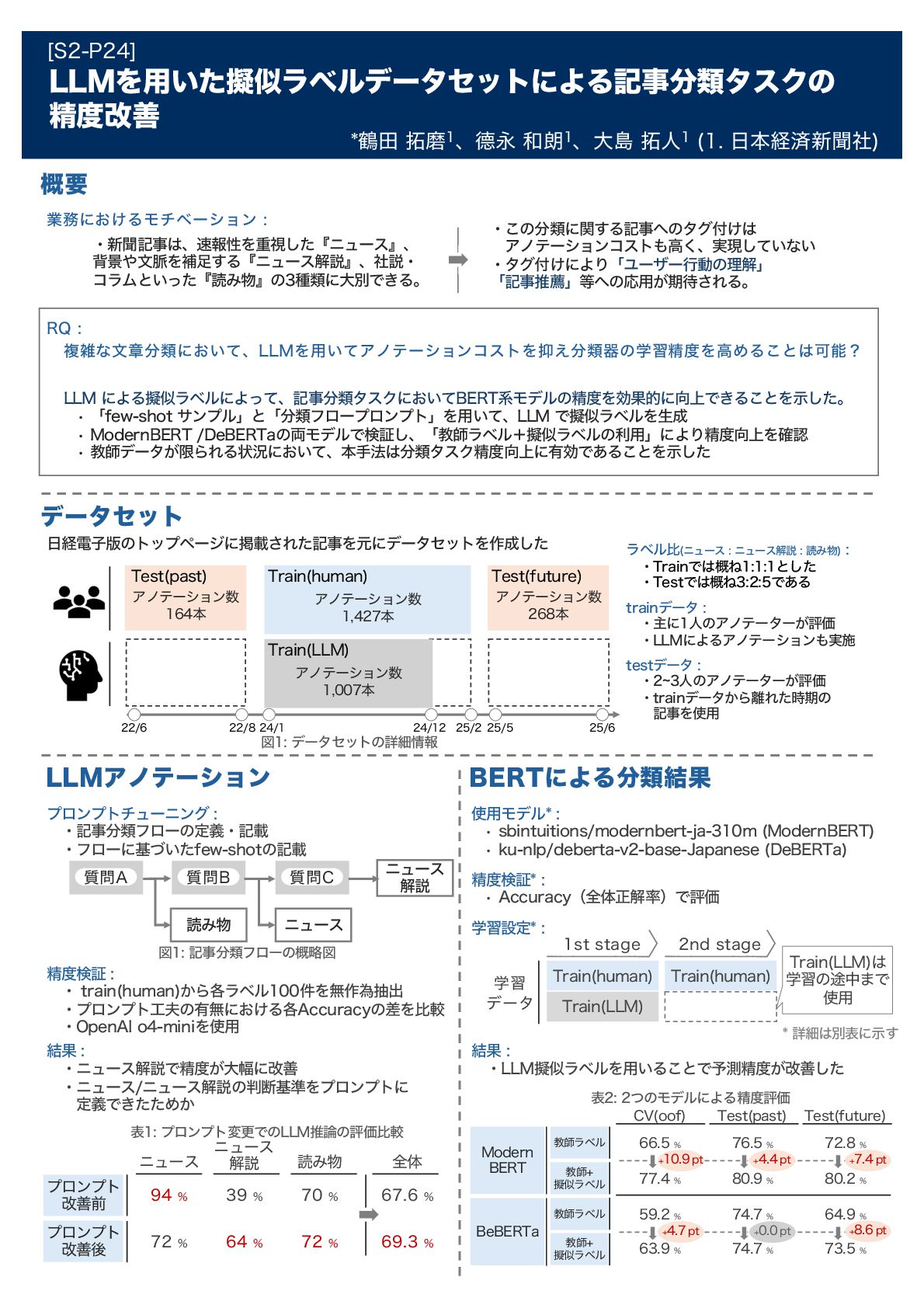 [S2-P24] LLMを用いた擬似ラベルデータセットによる記事分類タスクの精度改善