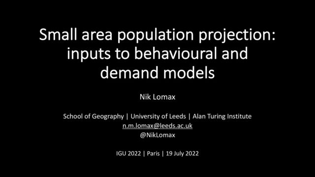Small area population projection: inputs to behavioural and demand models