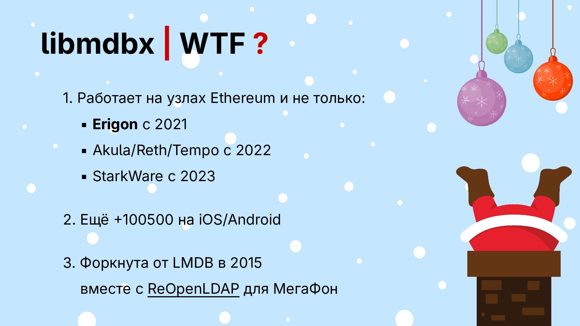 не только: ▪ Erigon c 2021 ▪ Akula/Reth/Tempo c 2022 ▪ StarkWare с 2023 2. Ещё +100500 на iOS/Android 3. Форкнута от LMDB в 2015 вместе с ReOpenLDAP для МегаФон