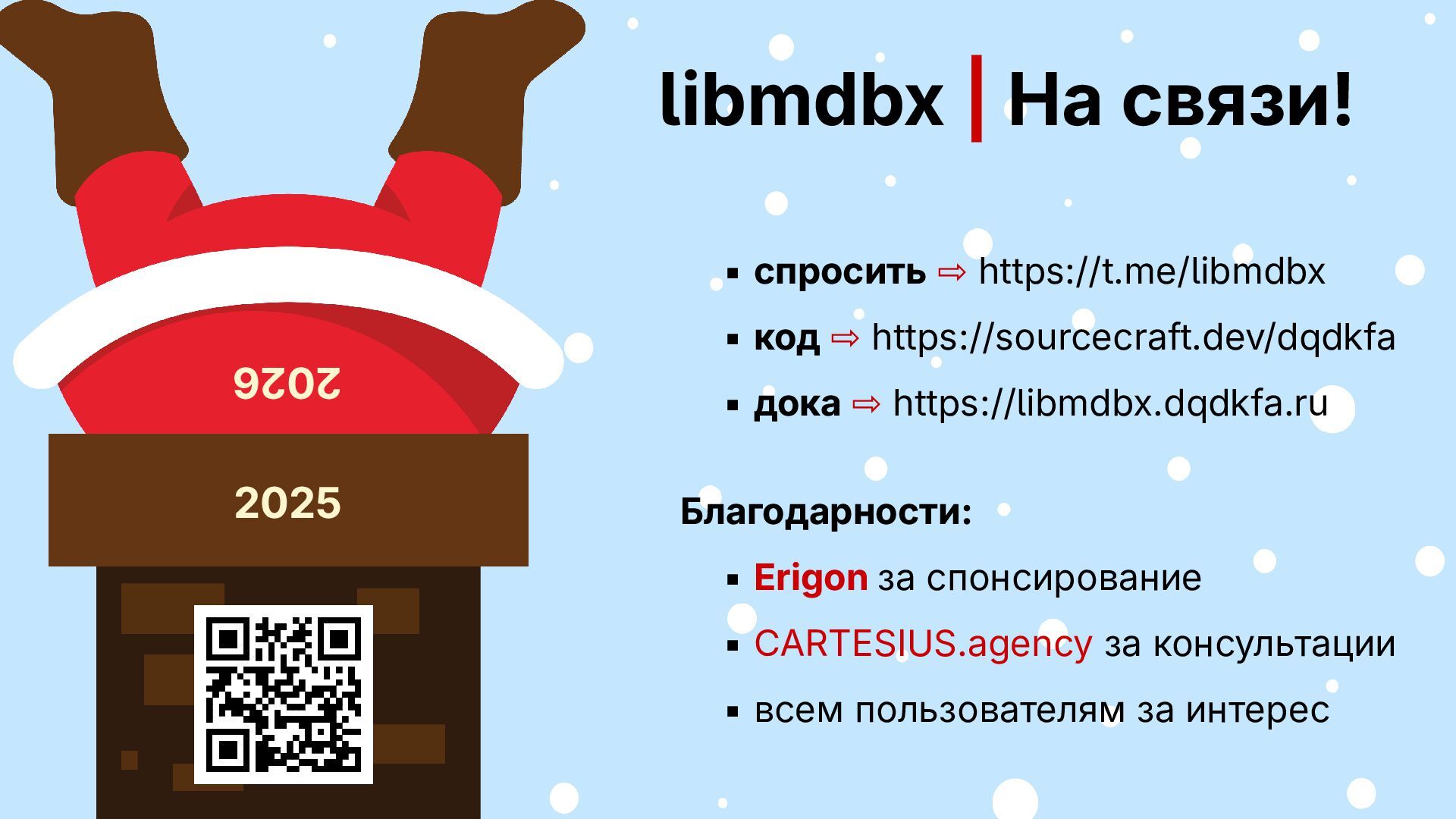 ⇨ https://sourcecraft.dev/dqdkfa ▪ дока ⇨ https://libmdbx.dqdkfa.ru Благодарности: ▪ Erigon за спонсирование ▪ CARTESIUS.agency за консультации ▪ всем пользователям за интерес 2026 2025