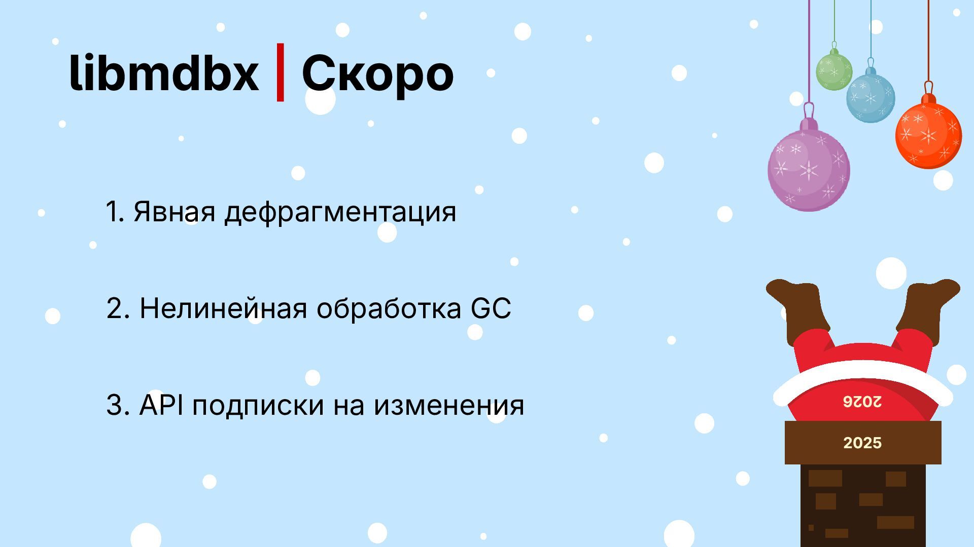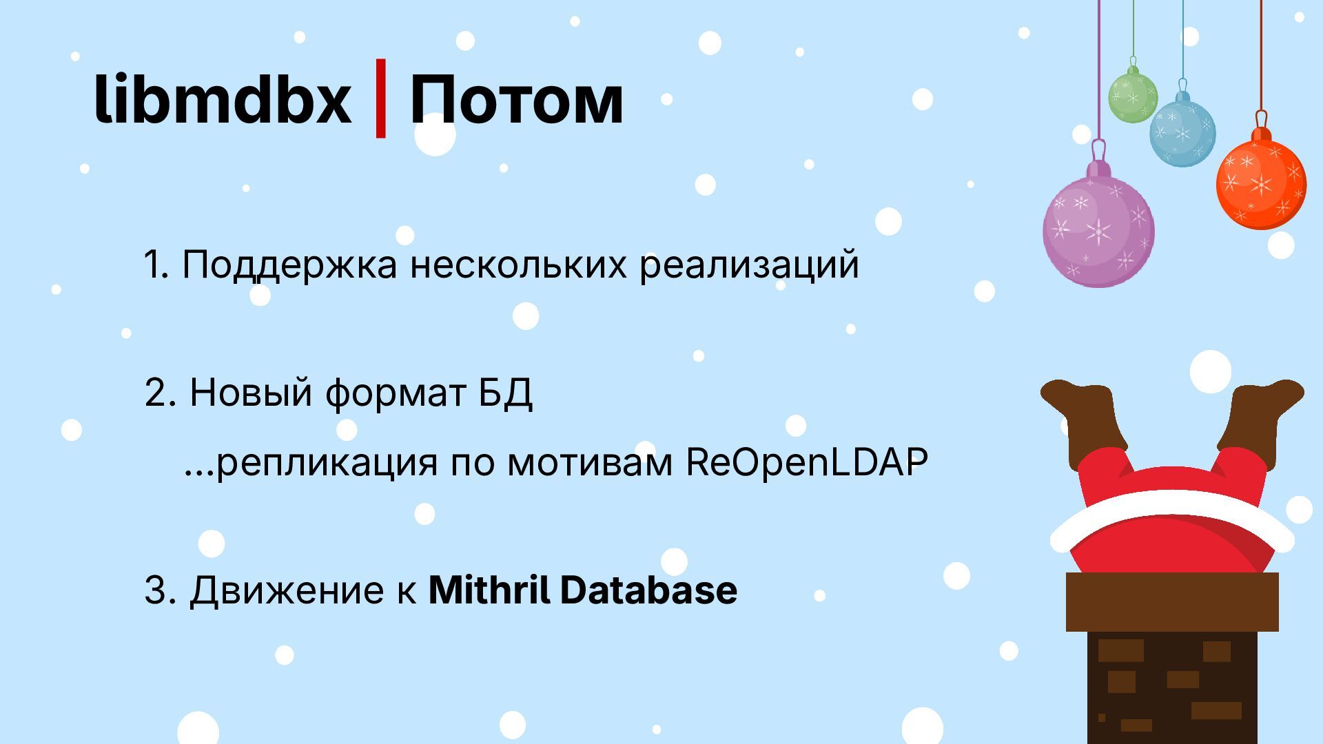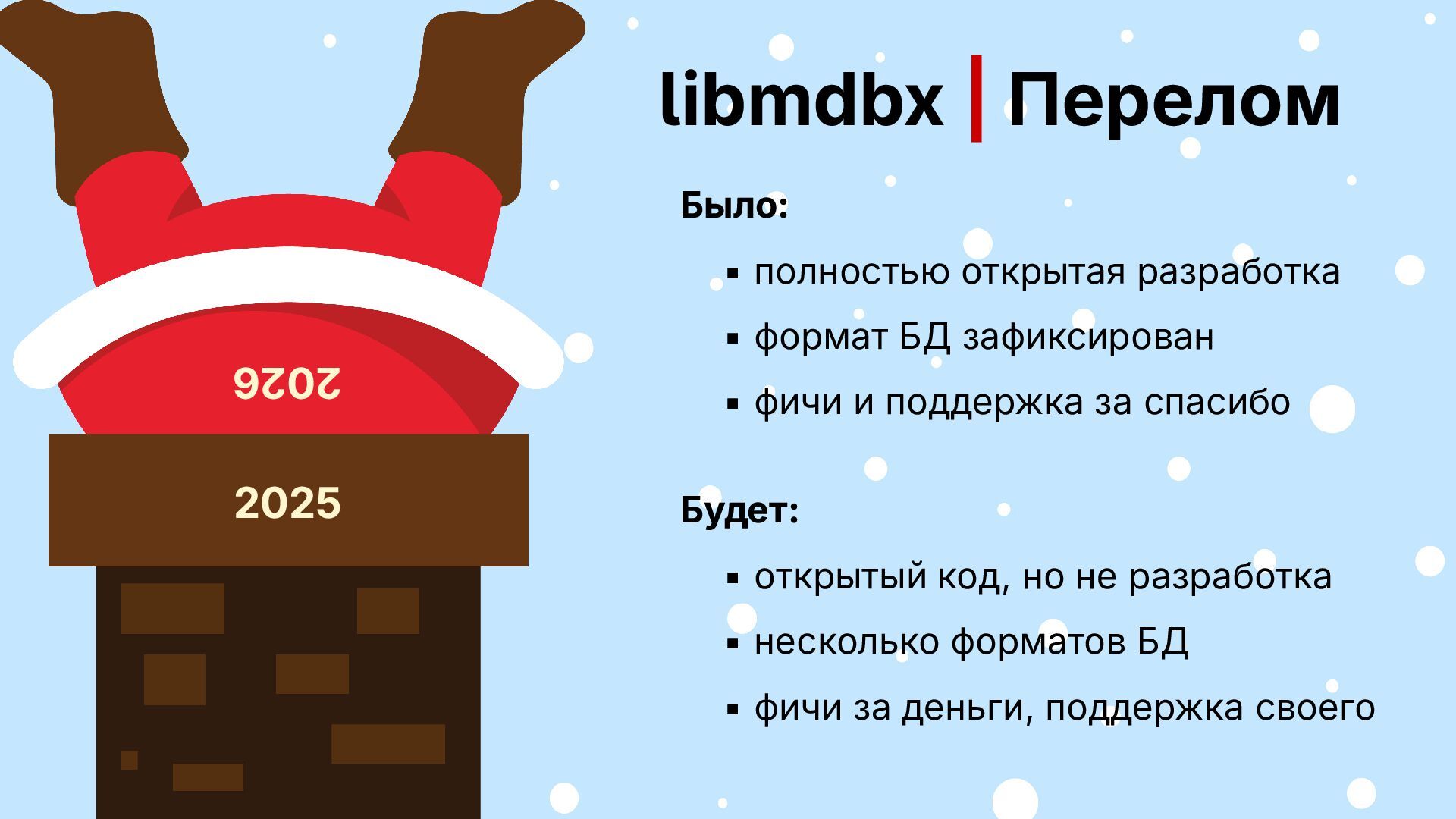 БД зафиксирован ▪ фичи и поддержка за спасибо Будет: ▪ открытый код, но не разработка ▪ несколько форматов БД ▪ фичи за деньги, поддержка своего 2026 2025