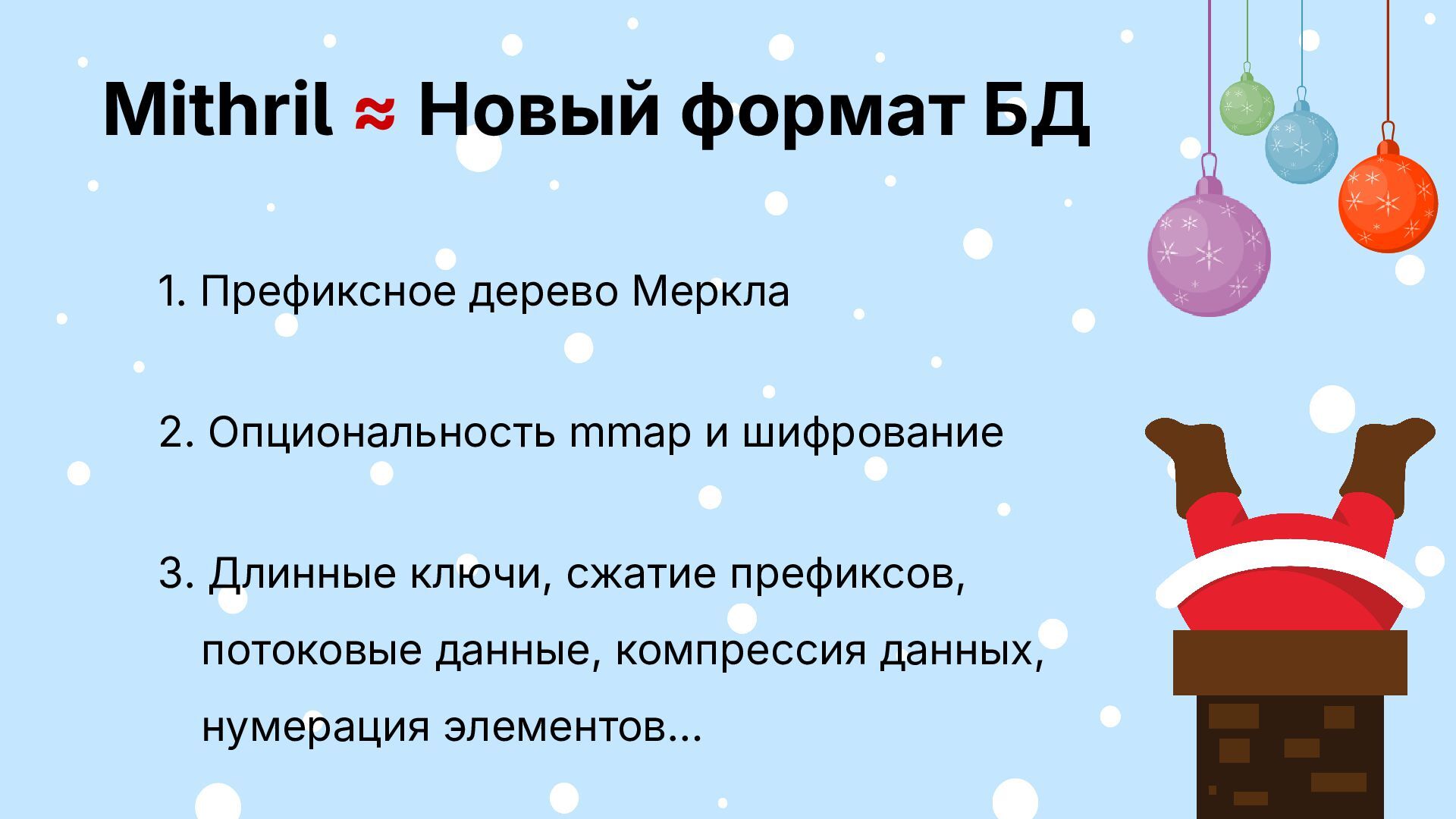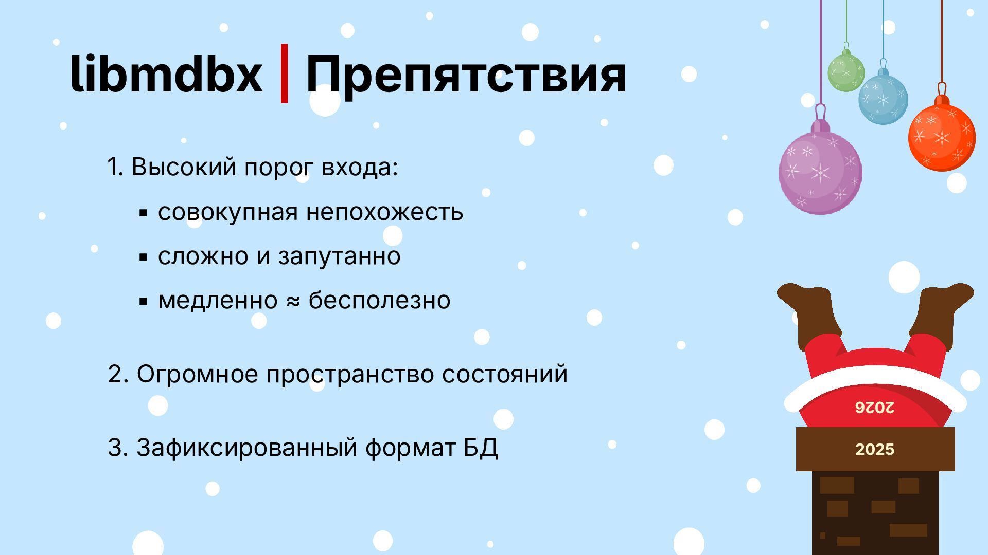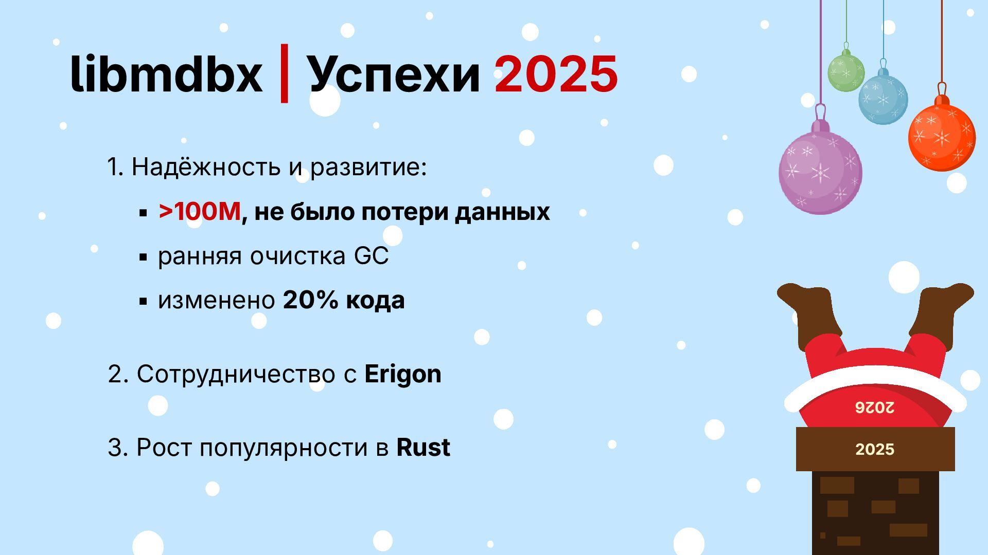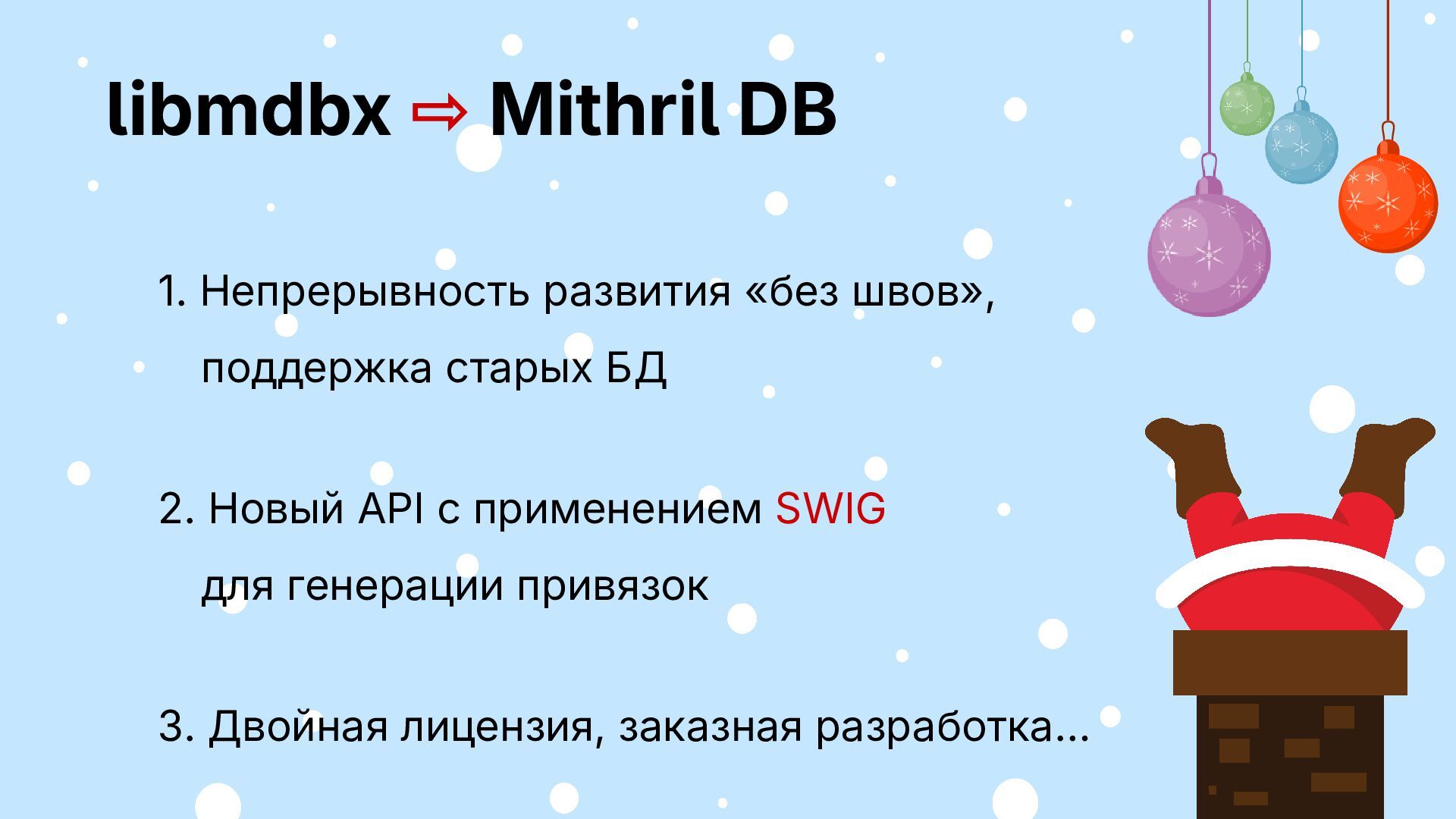 БД зафиксирован ▪ фичи и поддержка за спасибо Будет: ▪ открытый код, но не разработка ▪ несколько форматов БД ▪ фичи за деньги, поддержка своего 2026 2025