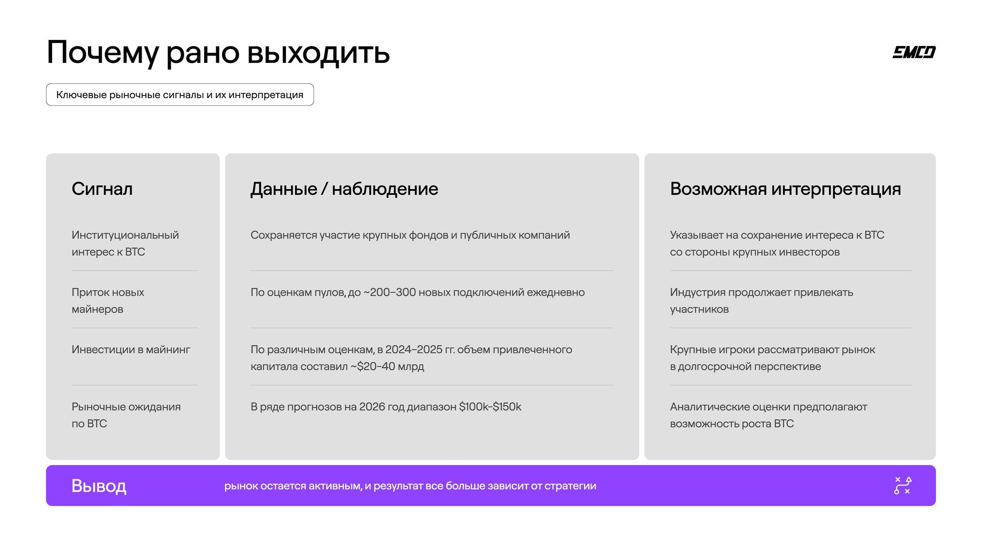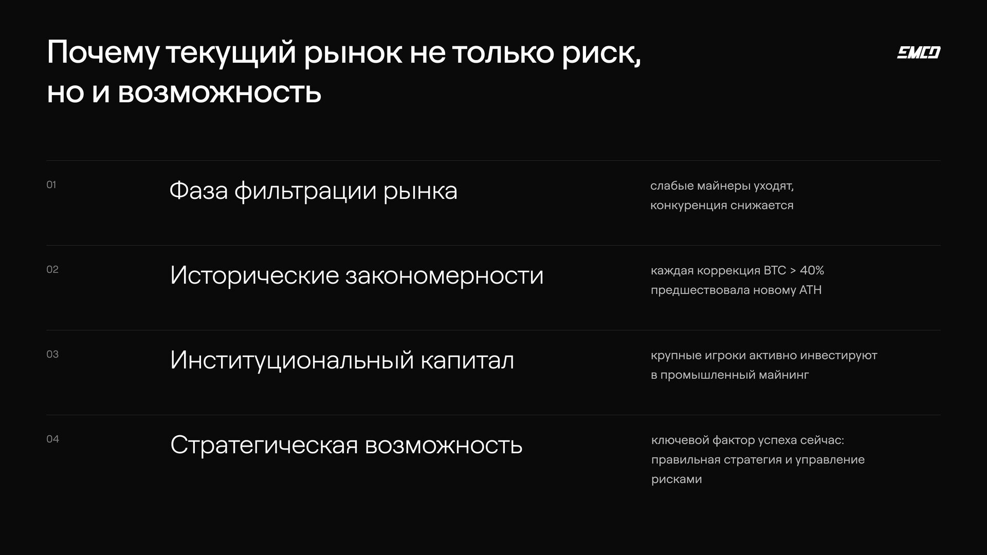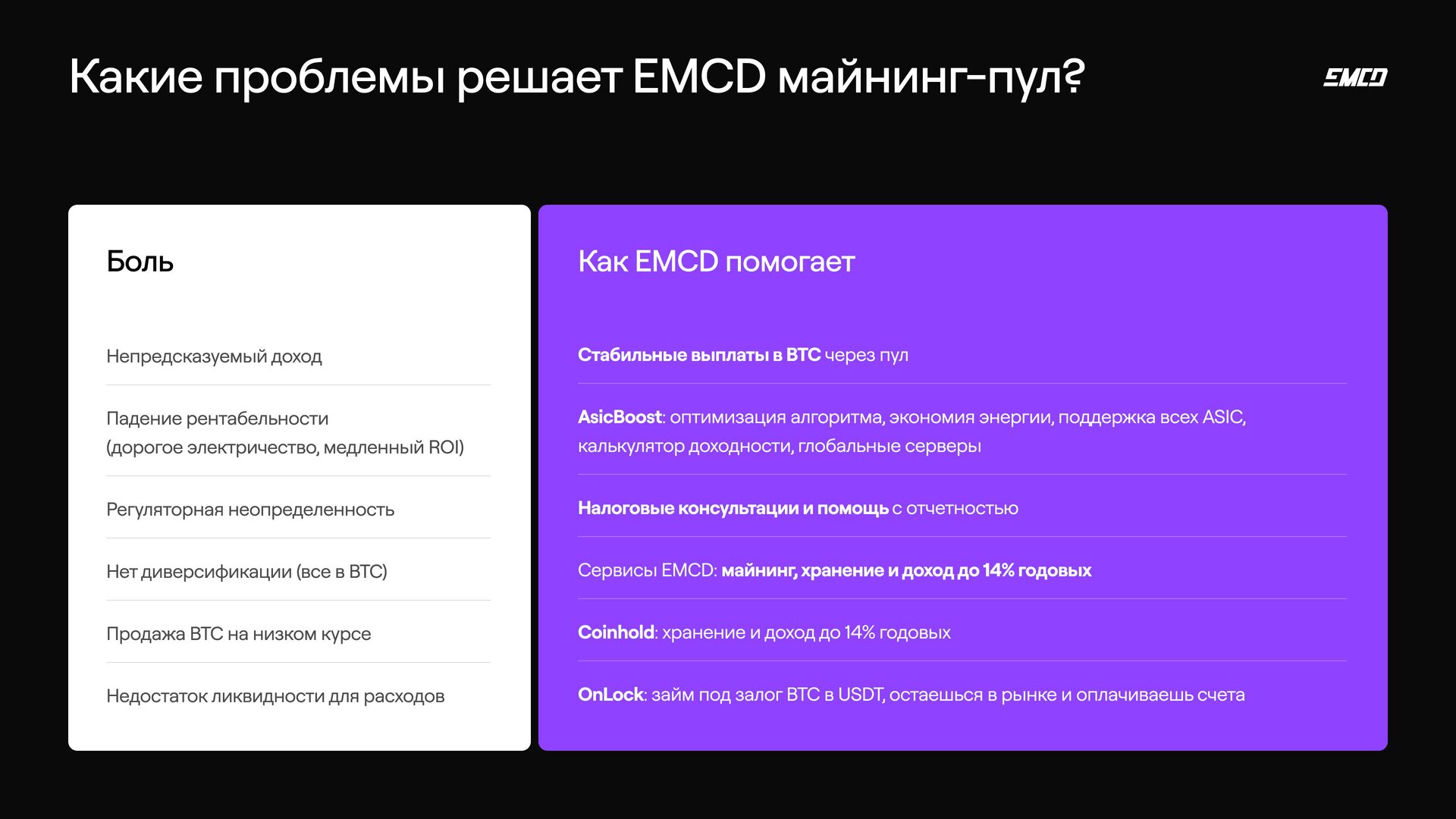 В ней рассматриваются ключевые вызовы отрасли, влияние текущих рыночных условий на доходность и подходы EMCD к повышению стабильности выплат и эффективности работы майнеров.