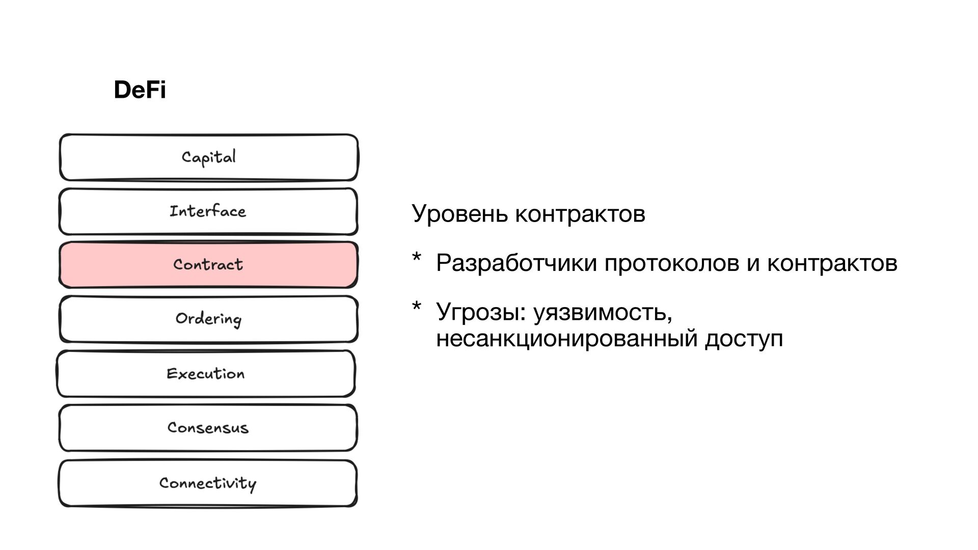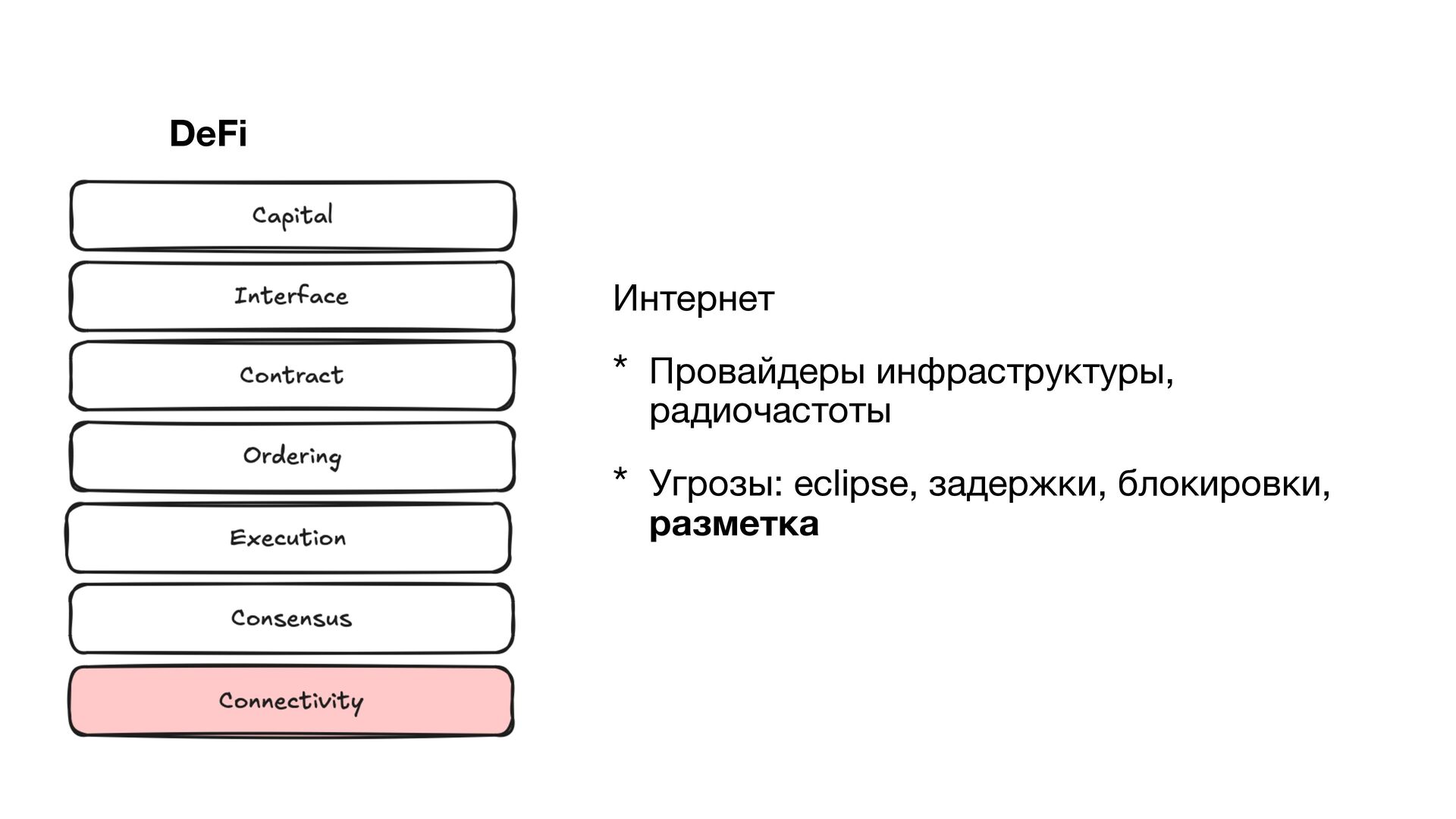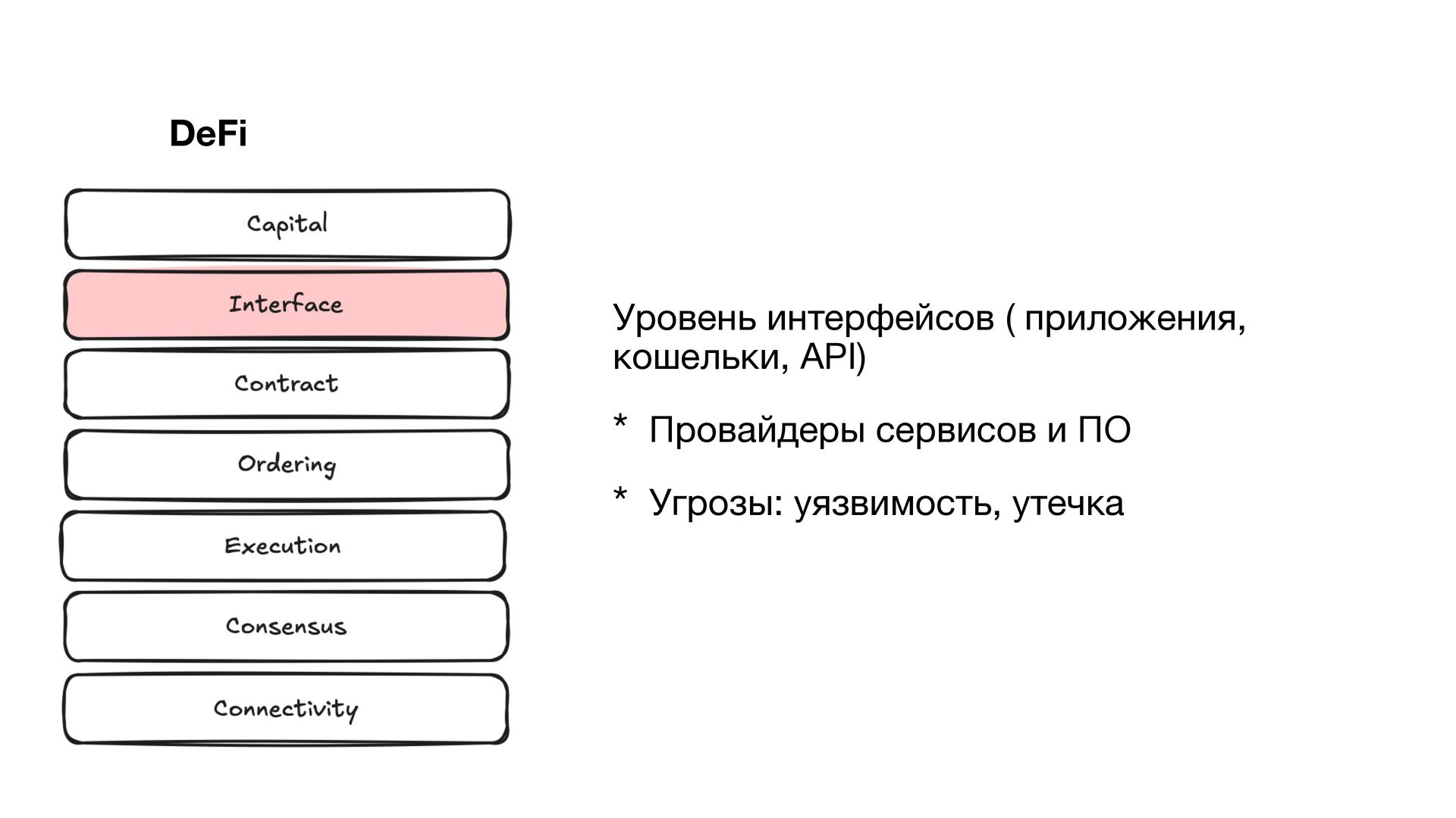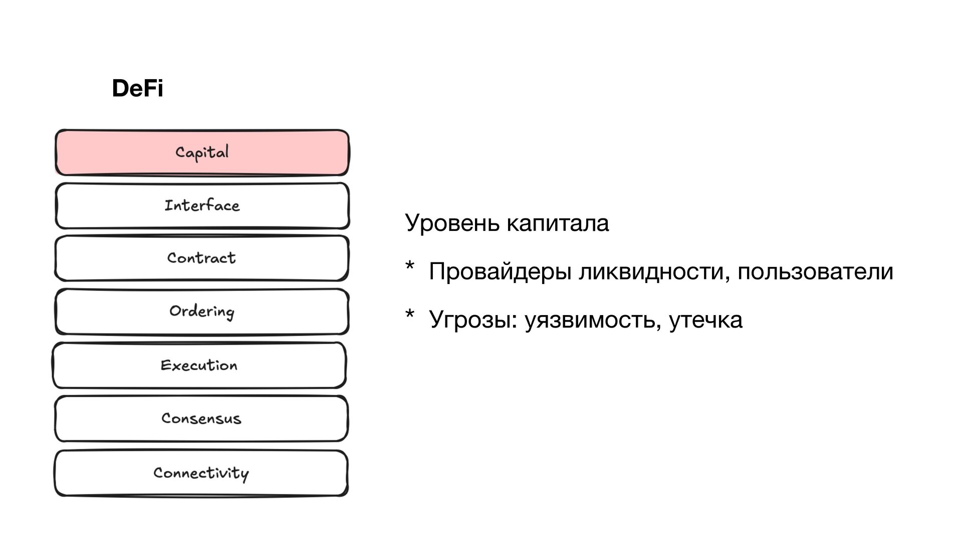 Презентация Владимира Попова, исполнительного директора Центра развития блокчейн Сбера на мероприятии DeFrens x Dash, посвящена роли приватности для финансовых институтов в DeFi и показывает, как привычные банковские операции можно разложить на уровни инфраструктуры, исполнения, упорядочивания, контрактов, интерфейсов и капитала, выделяя для каждого слоя ключевых участников и основные риски — от цензуры и MEV до утечек и уязвимостей.