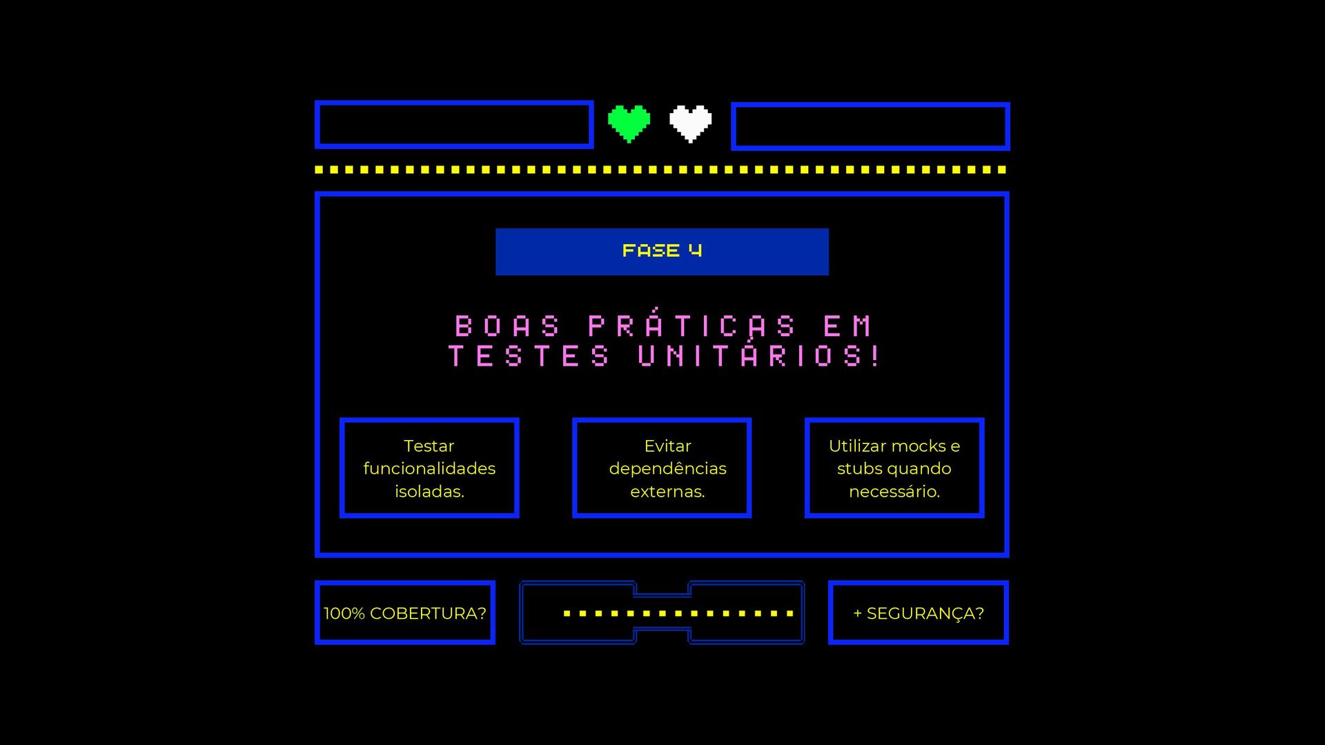 I C A S E M T E S T E S U N I T Á R I O S ! Testar funcionalidades isoladas. 100% COBERTURA? + SEGURANÇA? Testar funcionalidades isoladas. Evitar dependências externas. Utilizar mocks e stubs quando necessário.