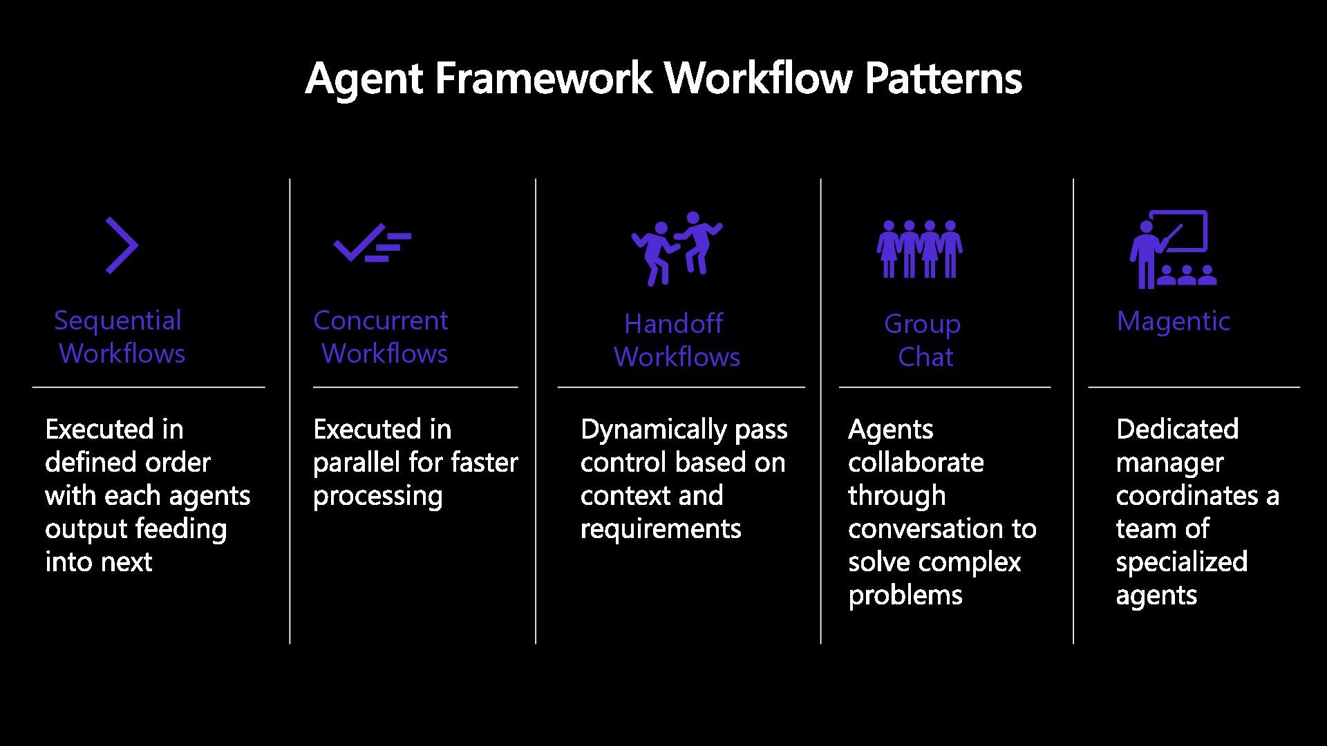 Group Chat Executed in defined order with each agents output feeding into next Executed in parallel for faster processing Dynamically pass control based on context and requirements Agents collaborate through conversation to solve complex problems Magentic Dedicated manager coordinates a team of specialized agents