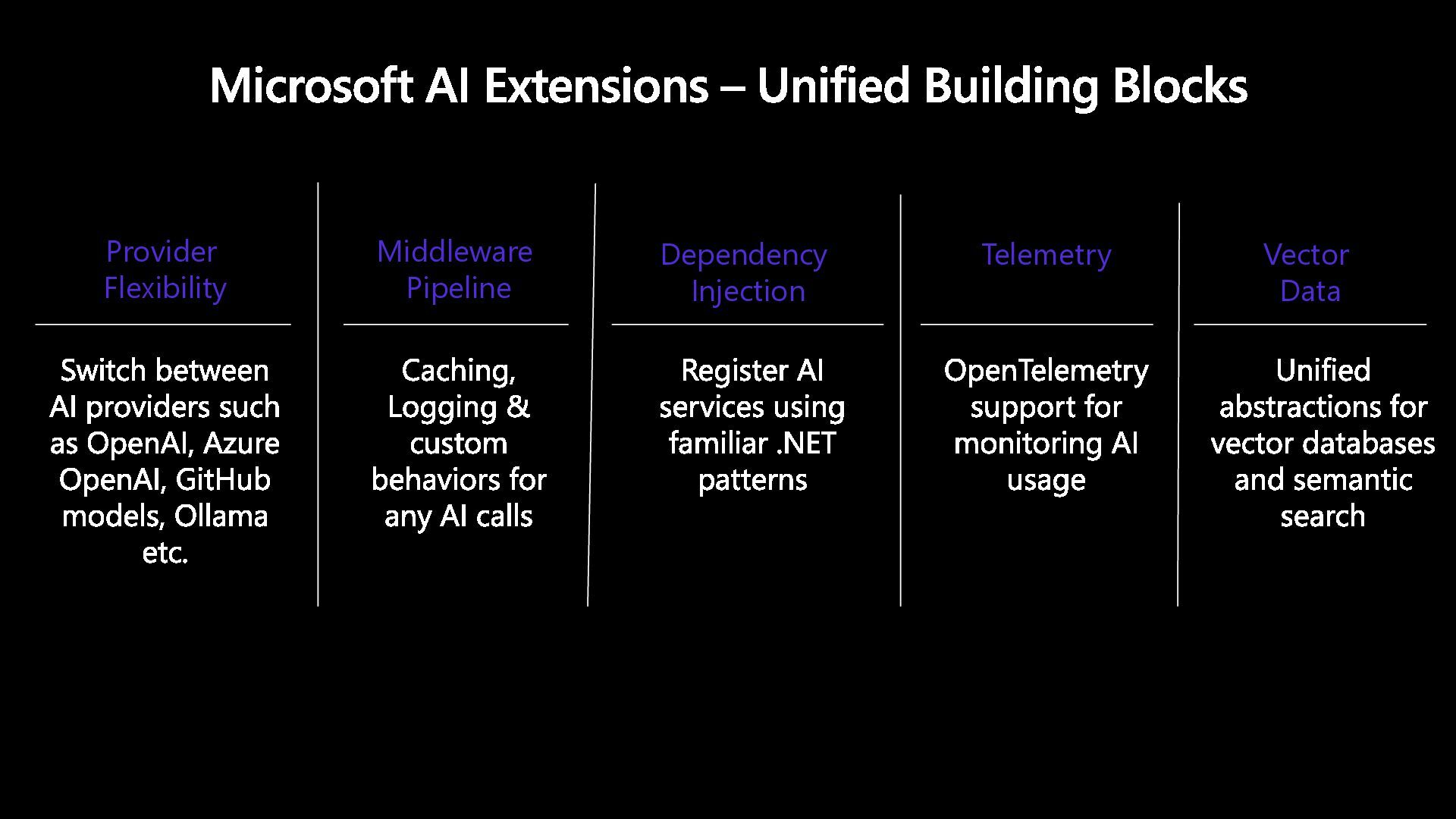 Pipeline Dependency Injection Telemetry Switch between AI providers such as OpenAI, Azure OpenAI, GitHub models, Ollama etc. Caching, Logging & custom behaviors for any AI calls Register AI services using familiar .NET patterns OpenTelemetry support for monitoring AI usage Vector Data Unified abstractions for vector databases and semantic search