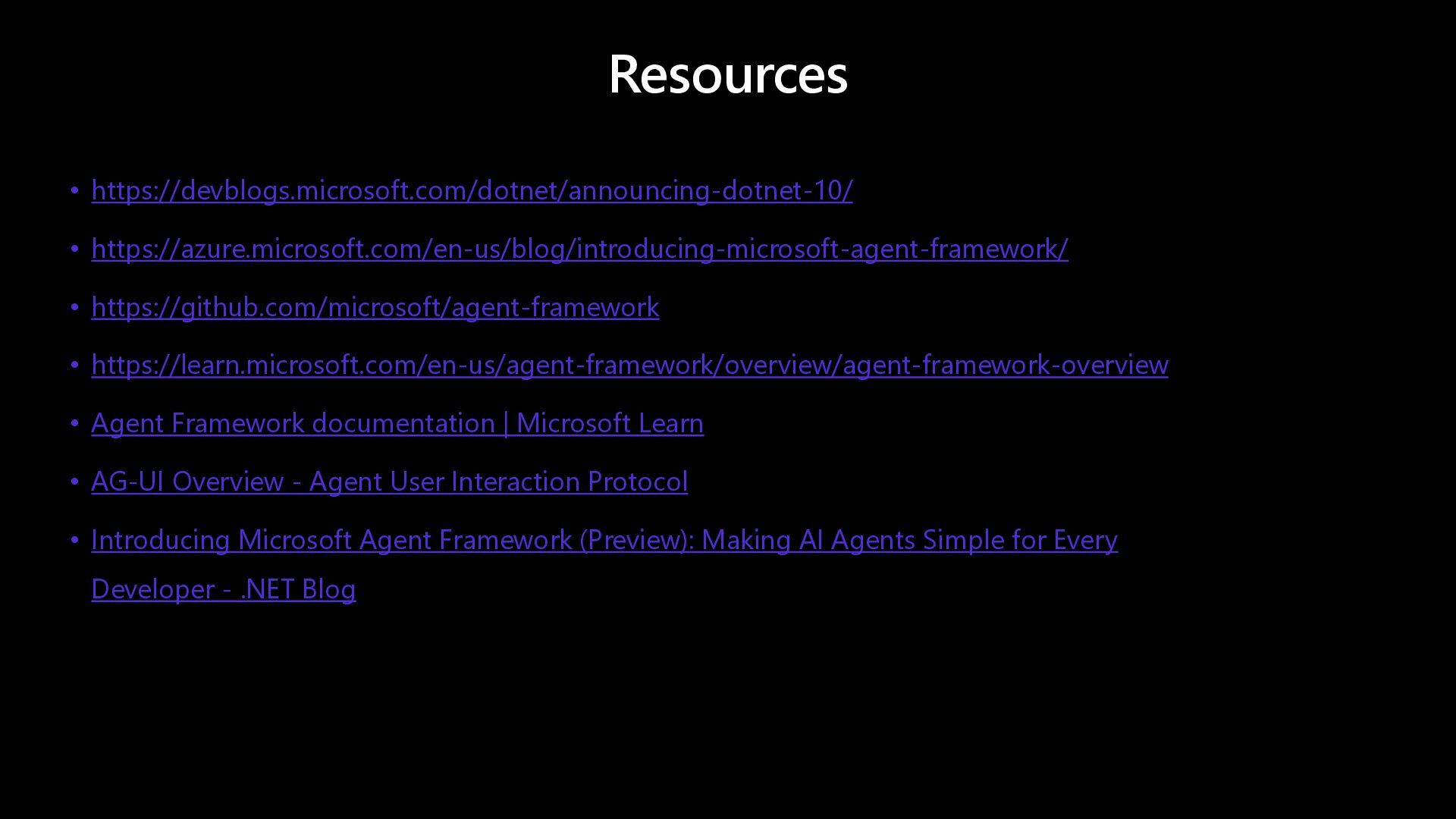 Agent Framework documentation | Microsoft Learn • AG-UI Overview - Agent User Interaction Protocol • Introducing Microsoft Agent Framework (Preview): Making AI Agents Simple for Every Developer - .NET Blog