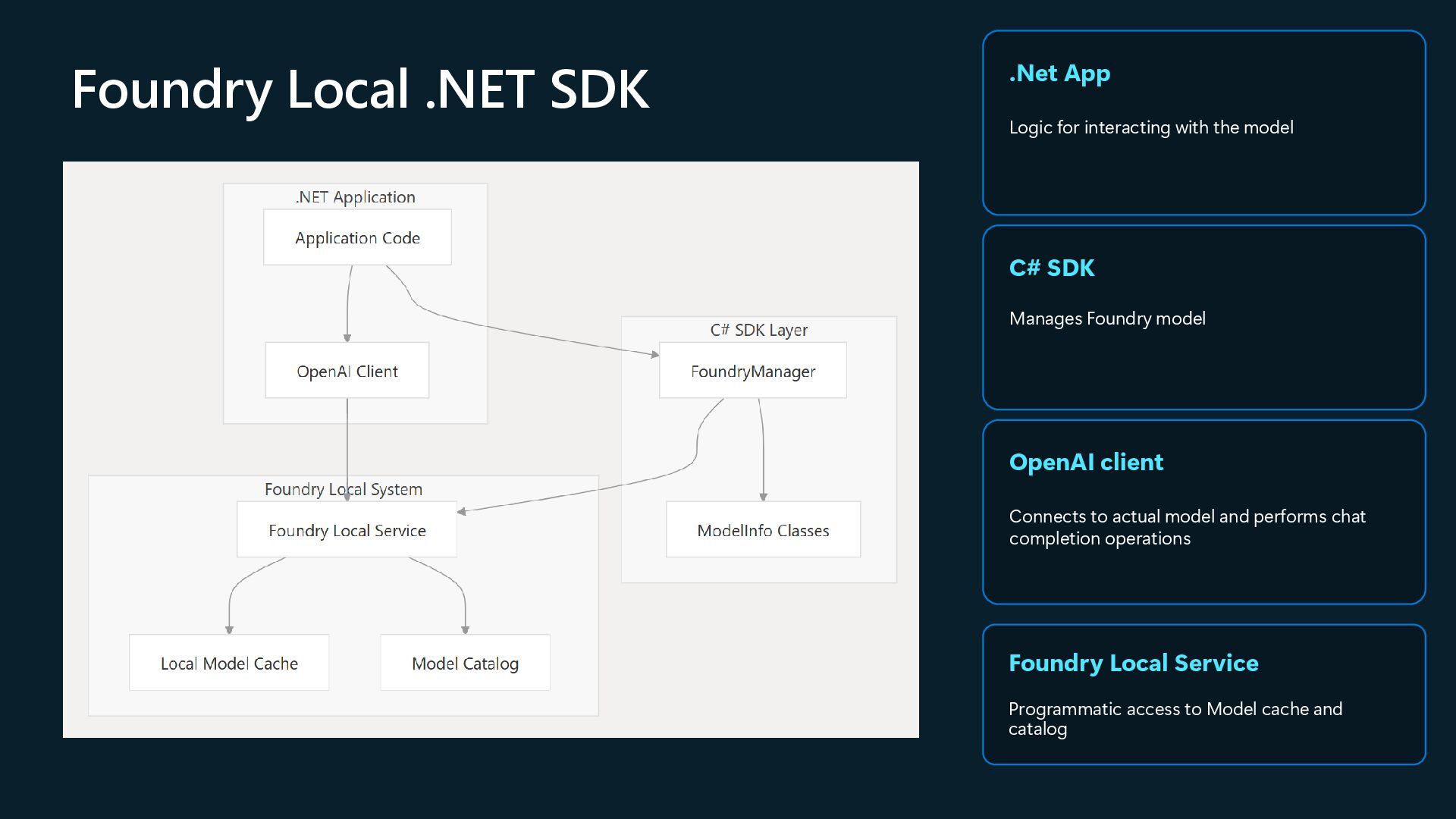 the model C# SDK Manages Foundry model OpenAI client Connects to actual model and performs chat completion operations Foundry Local Service Programmatic access to Model cache and catalog
