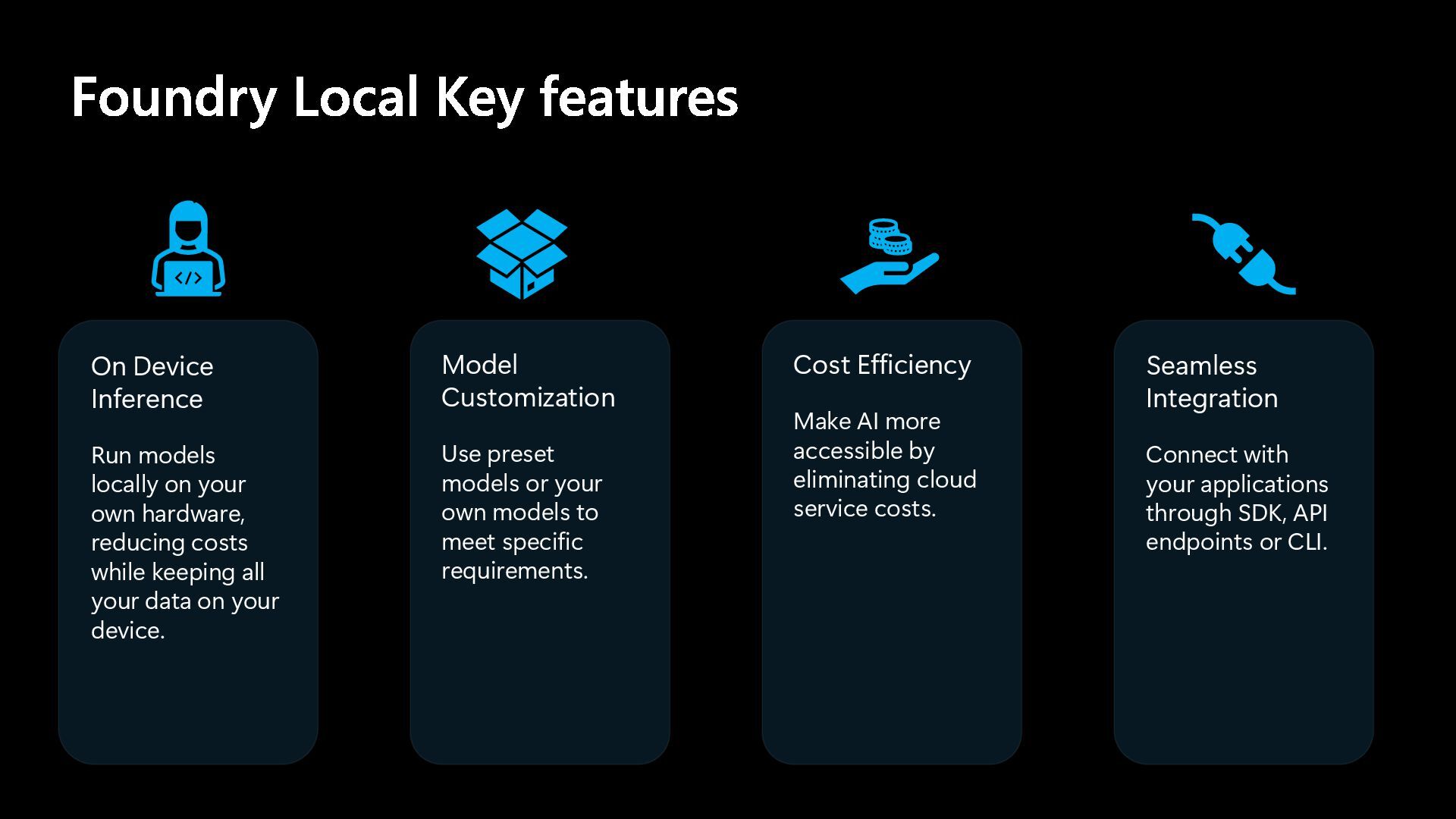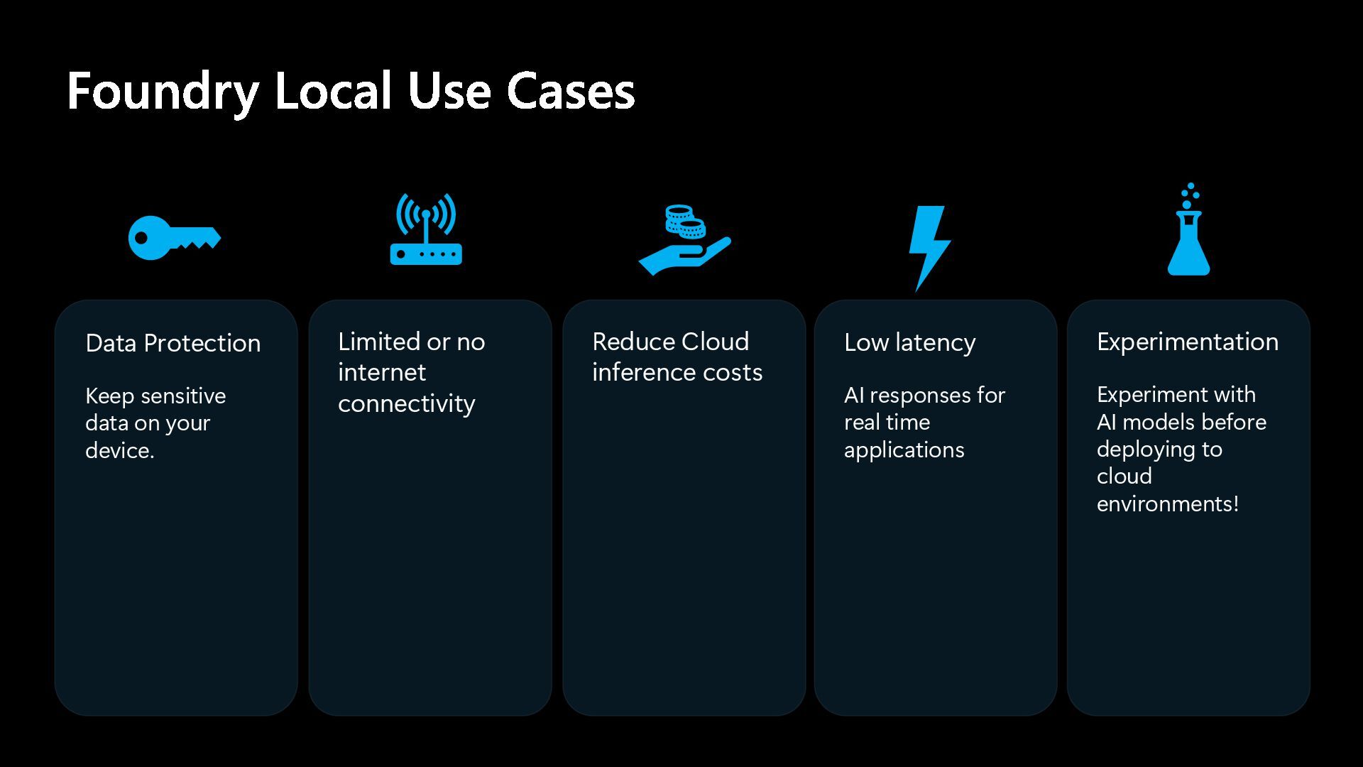 and optimized with hardware vendors Mac: GPU Acceleration on Apple Silicon Foundry Local Management Service Download and run models at runtime Foundry CLI & SDK CLI: Manage models, tools & agents SDK: Integrate and interact with model management and local inference Local AI Agents using MCP Call local tools for smart automations