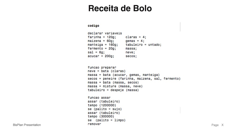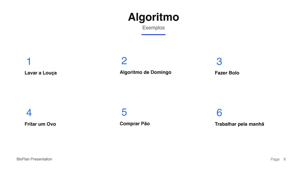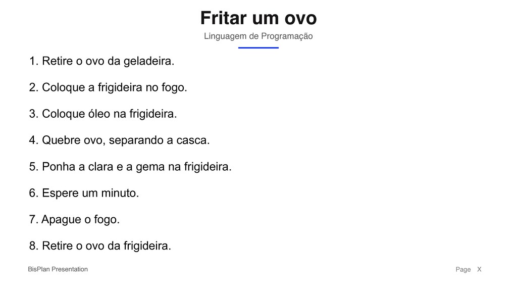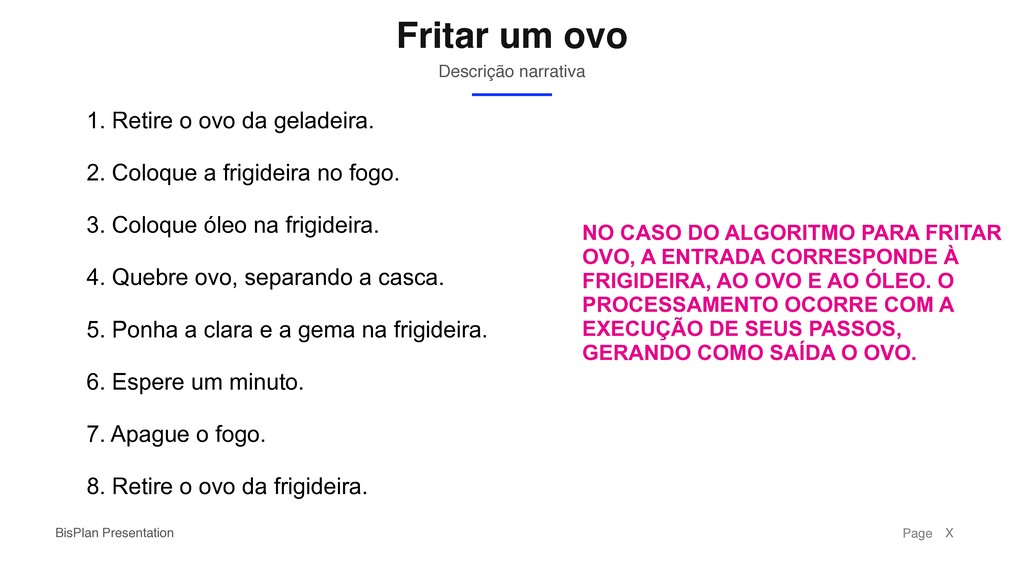 Retire o ovo da geladeira. 2. Coloque a frigideira no fogo. 3. Coloque óleo na frigideira. 4. Quebre ovo, separando a casca. 5. Ponha a clara e a gema na frigideira. 6. Espere um minuto. 7. Apague o fogo. 8. Retire o ovo da frigideira. NO CASO DO ALGORITMO PARA FRITAR OVO, A ENTRADA CORRESPONDE À FRIGIDEIRA, AO OVO E AO ÓLEO. O PROCESSAMENTO OCORRE COM A EXECUÇÃO DE SEUS PASSOS, GERANDO COMO SAÍDA O OVO.