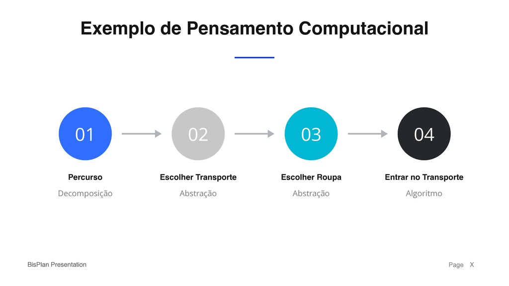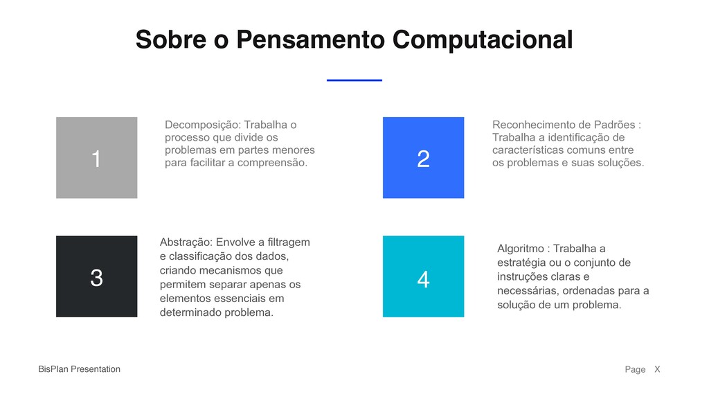 o processo que divide os problemas em partes menores para facilitar a compreensão. 1 Abstração: Envolve a filtragem e classificação dos dados, criando mecanismos que permitem separar apenas os elementos essenciais em determinado problema. Reconhecimento de Padrões : Trabalha a identificação de características comuns entre os problemas e suas soluções. Algoritmo : Trabalha a estratégia ou o conjunto de instruções claras e necessárias, ordenadas para a solução de um problema. 2 3 4